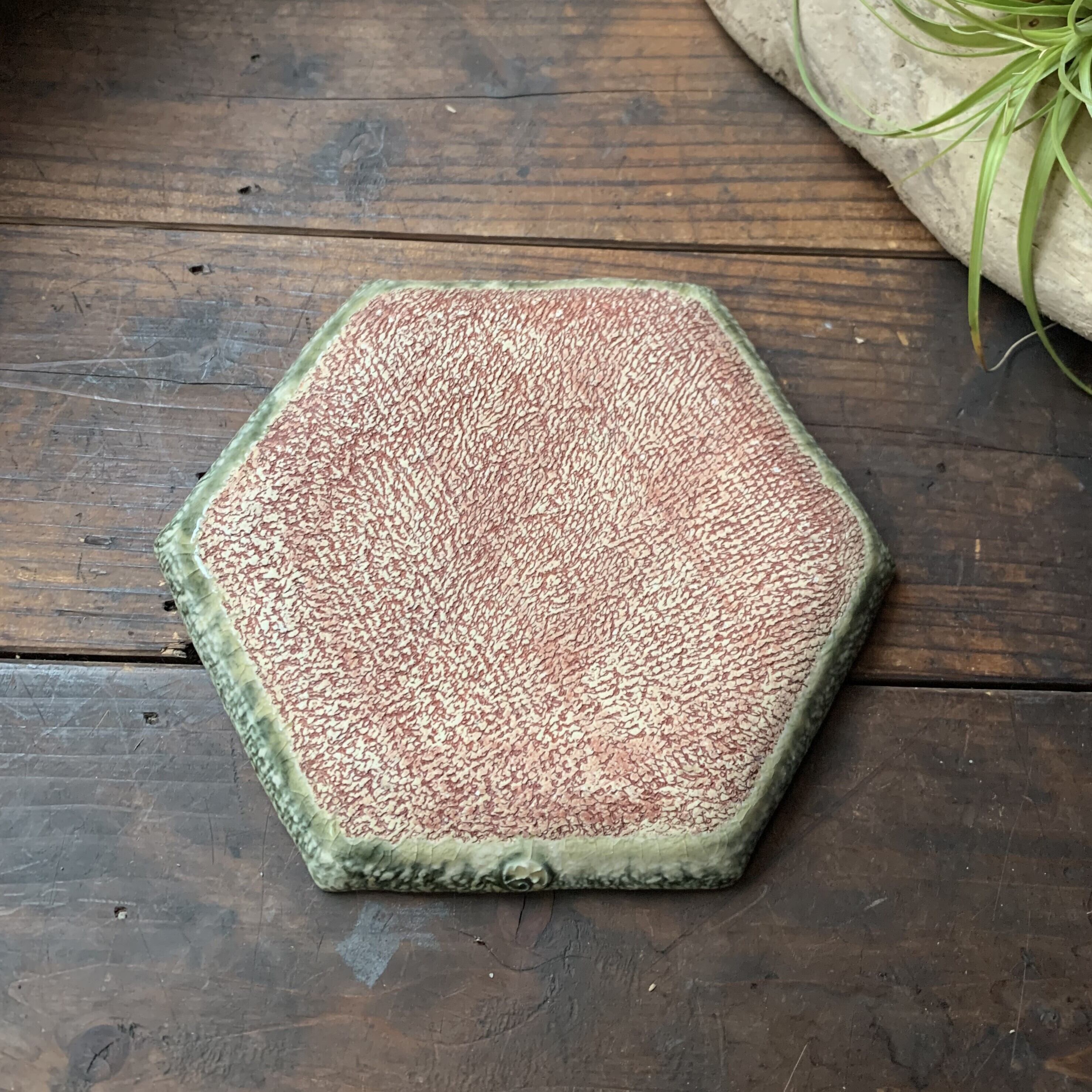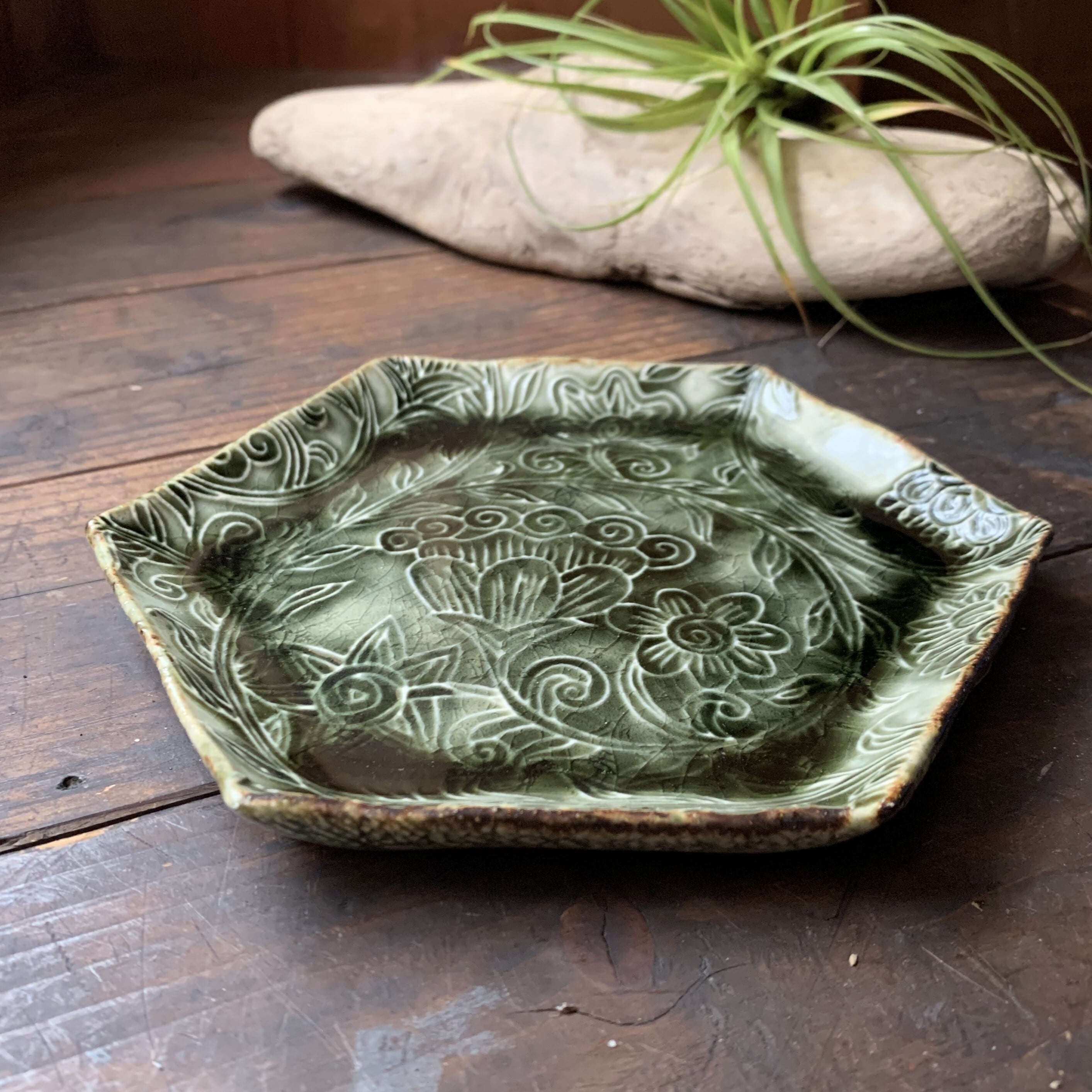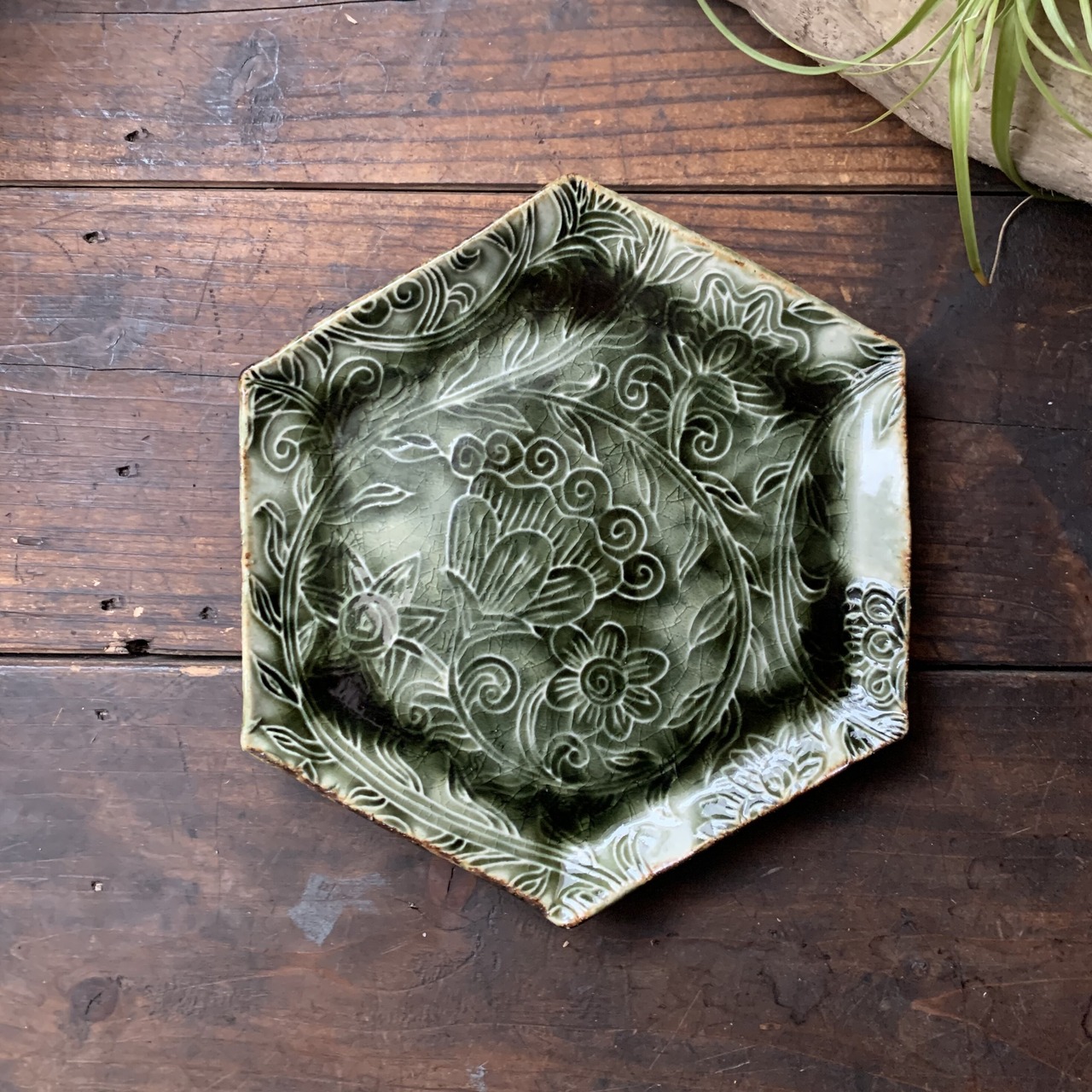 つやがあり美しい濃淡のある深緑で、個性豊かな唐草の刻文が入った六角皿です。