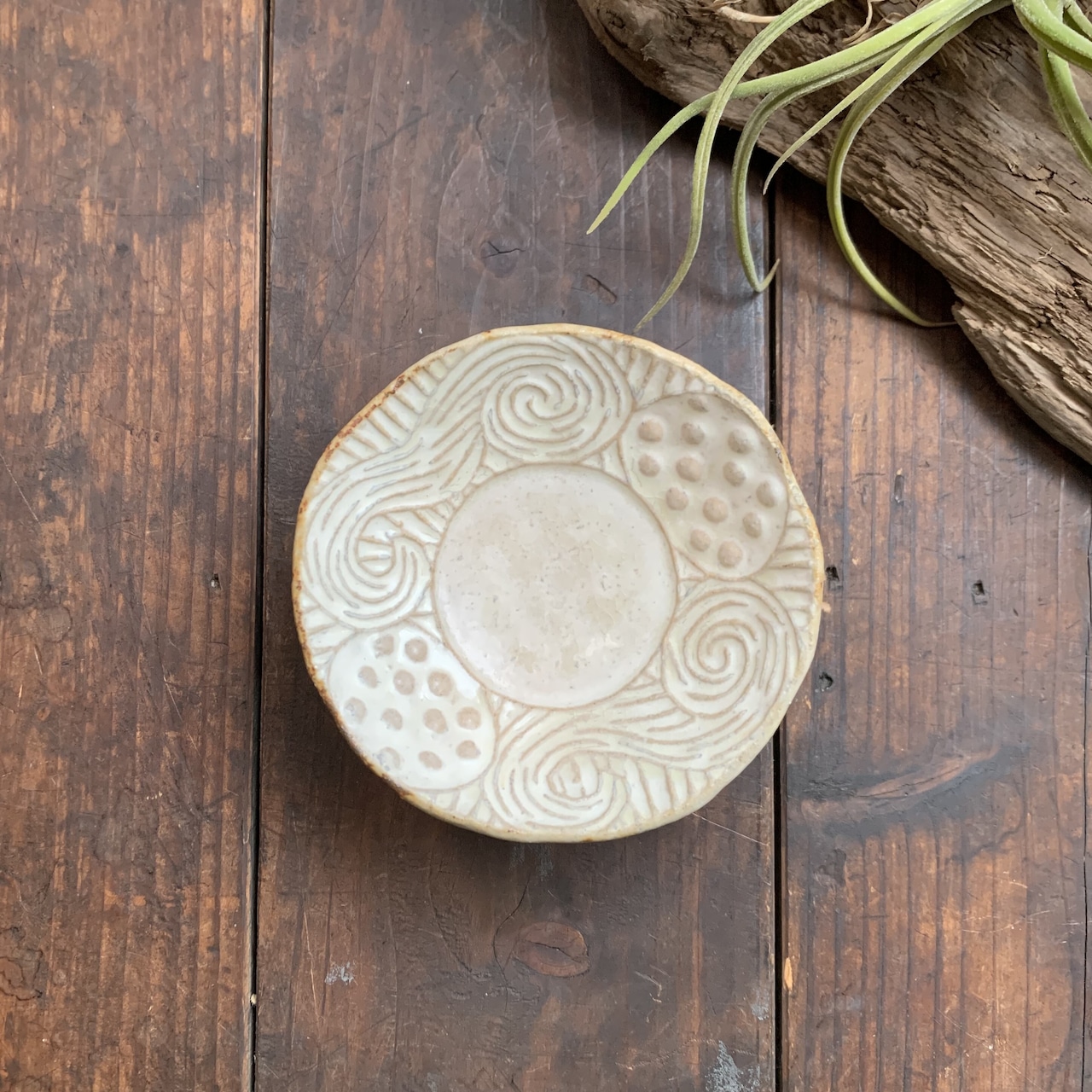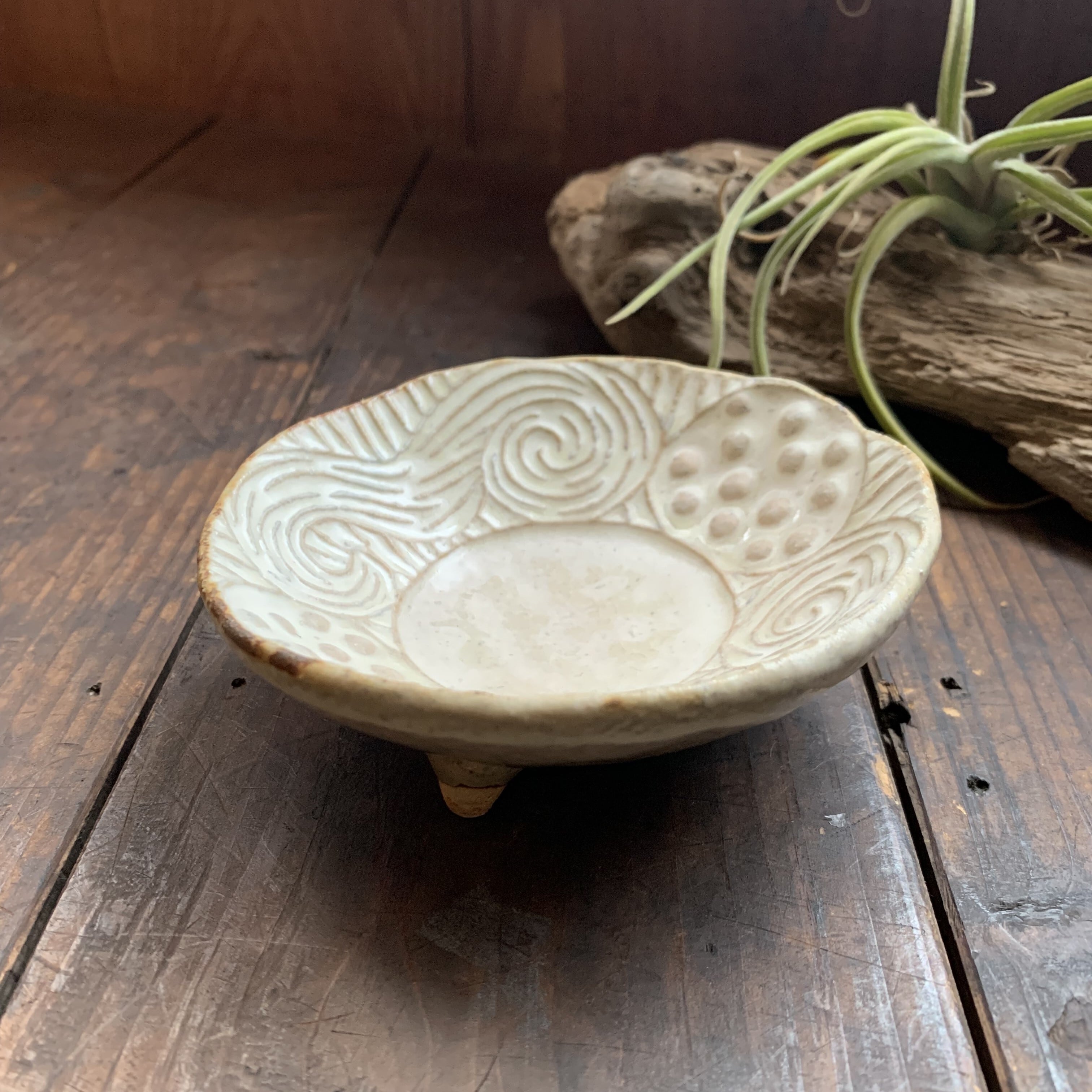 アイボリー色が素敵な足付小鉢です。素朴な色合いが上品に食卓を彩ってくれます。手になじむ丸いフォルムに、足つきデザインが特徴的です。流れるような唐草模様の刻文がいつものお料理に優しくスパイスを与えてくれる…そんな素敵な小鉢です。お客様やお友達をおもてなしする場でも、あなたのセンスを演出してくれること間違いなしでしょう。