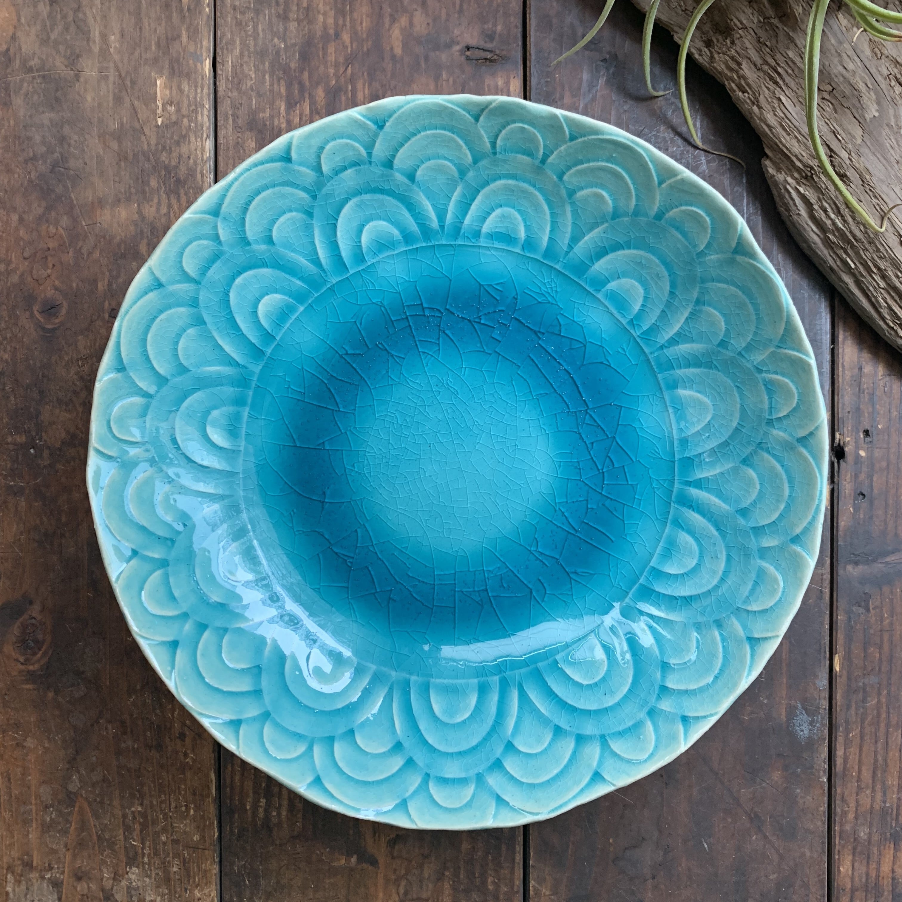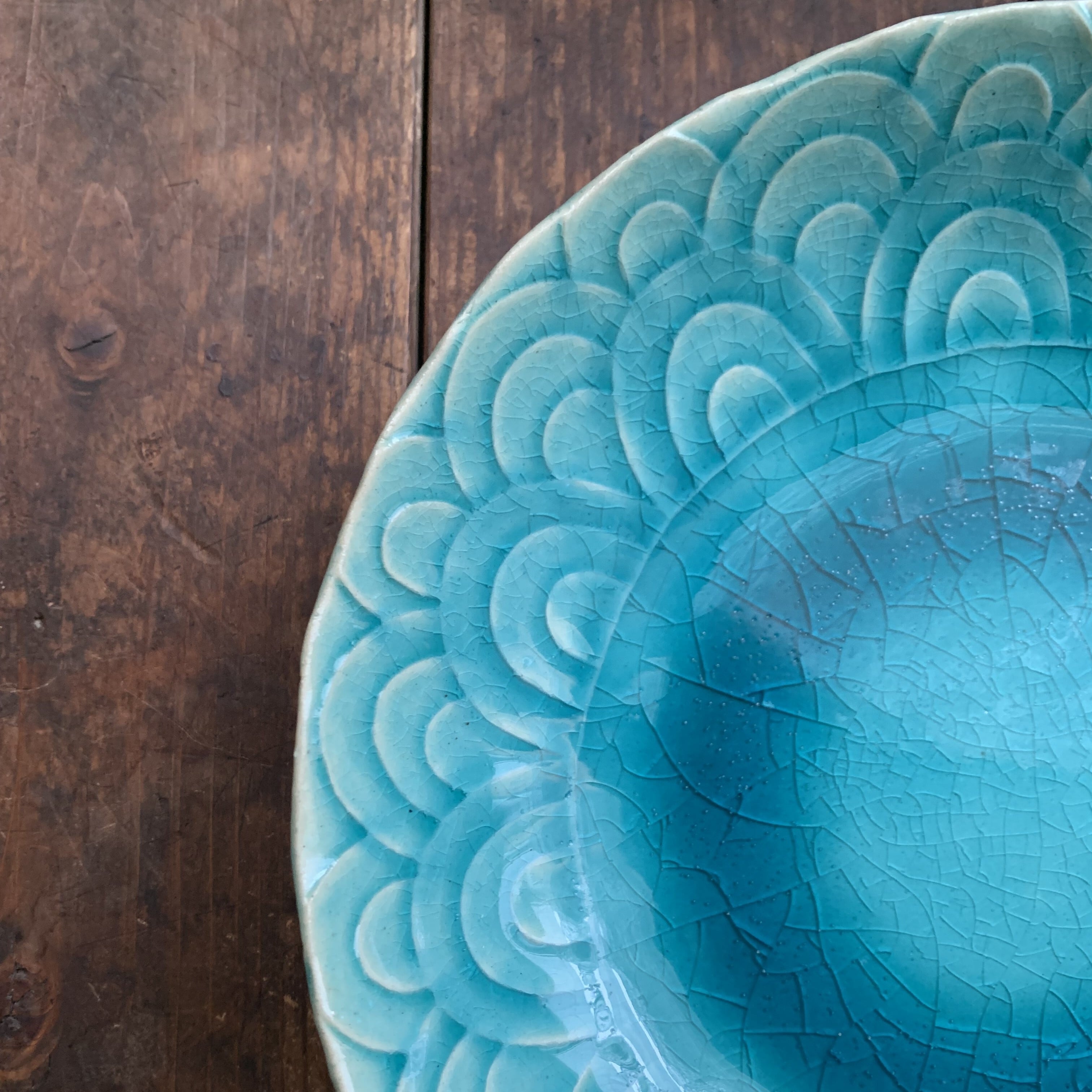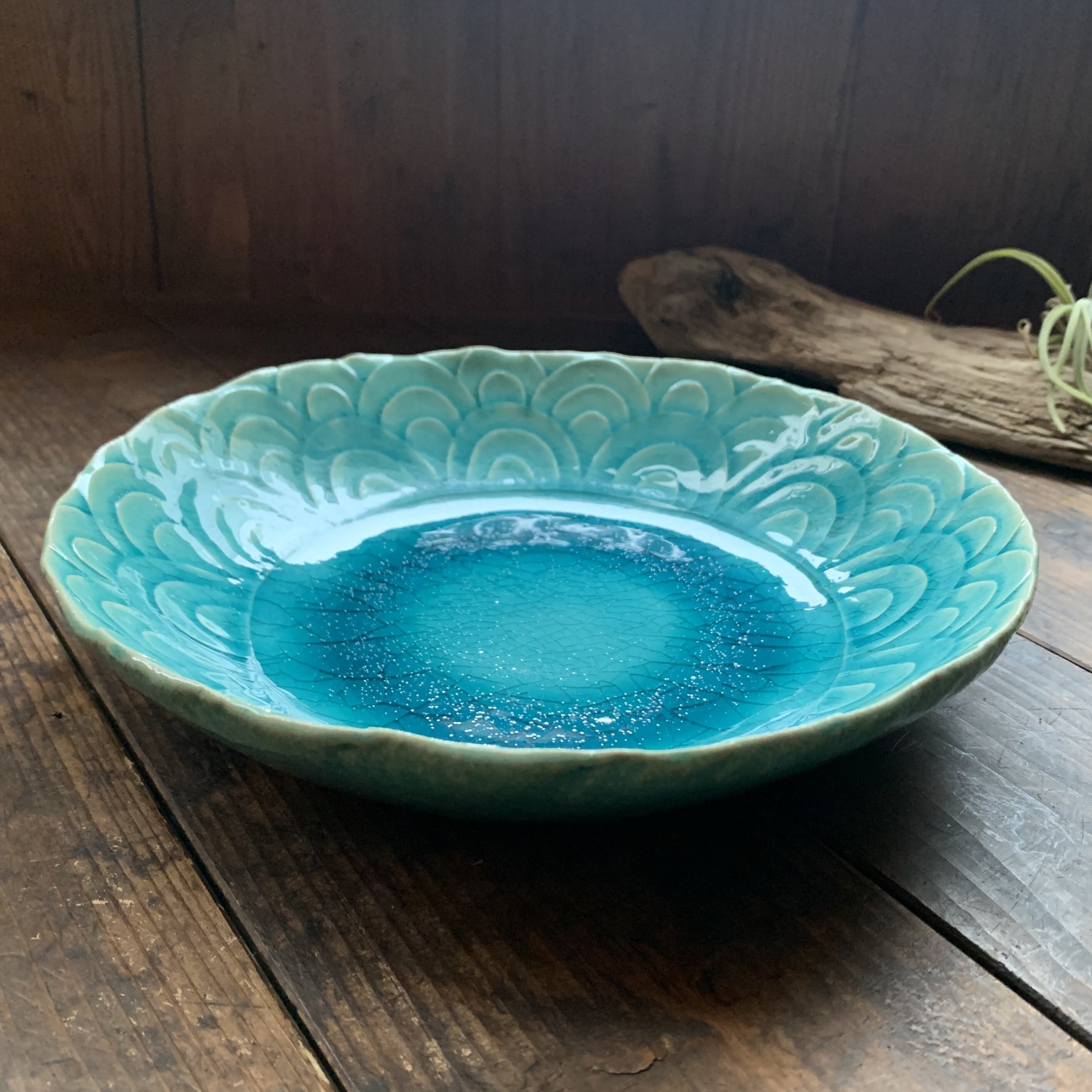 光沢のあるターコイズブルーに、波模様の青海波柄が素敵な大皿です。深みがあります。