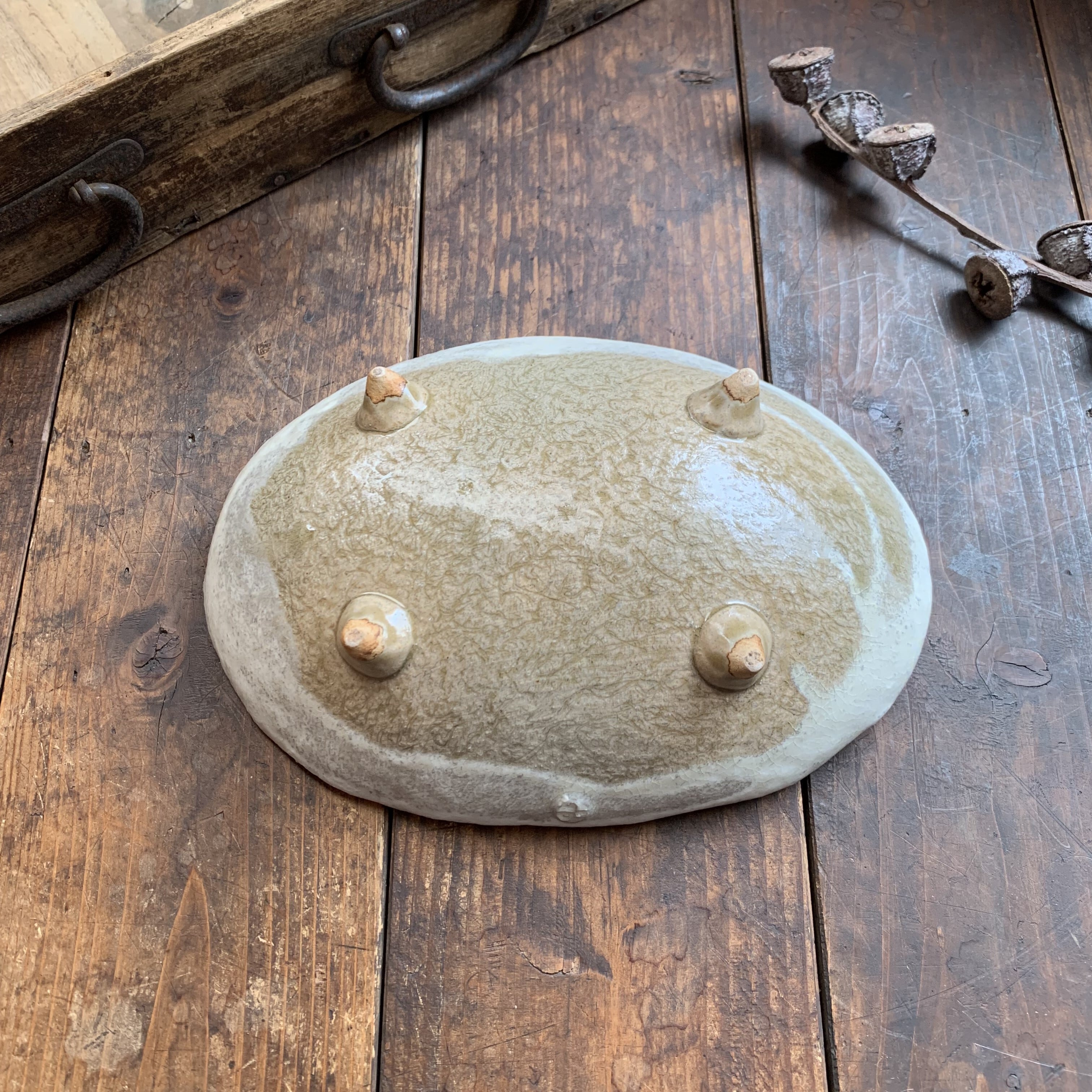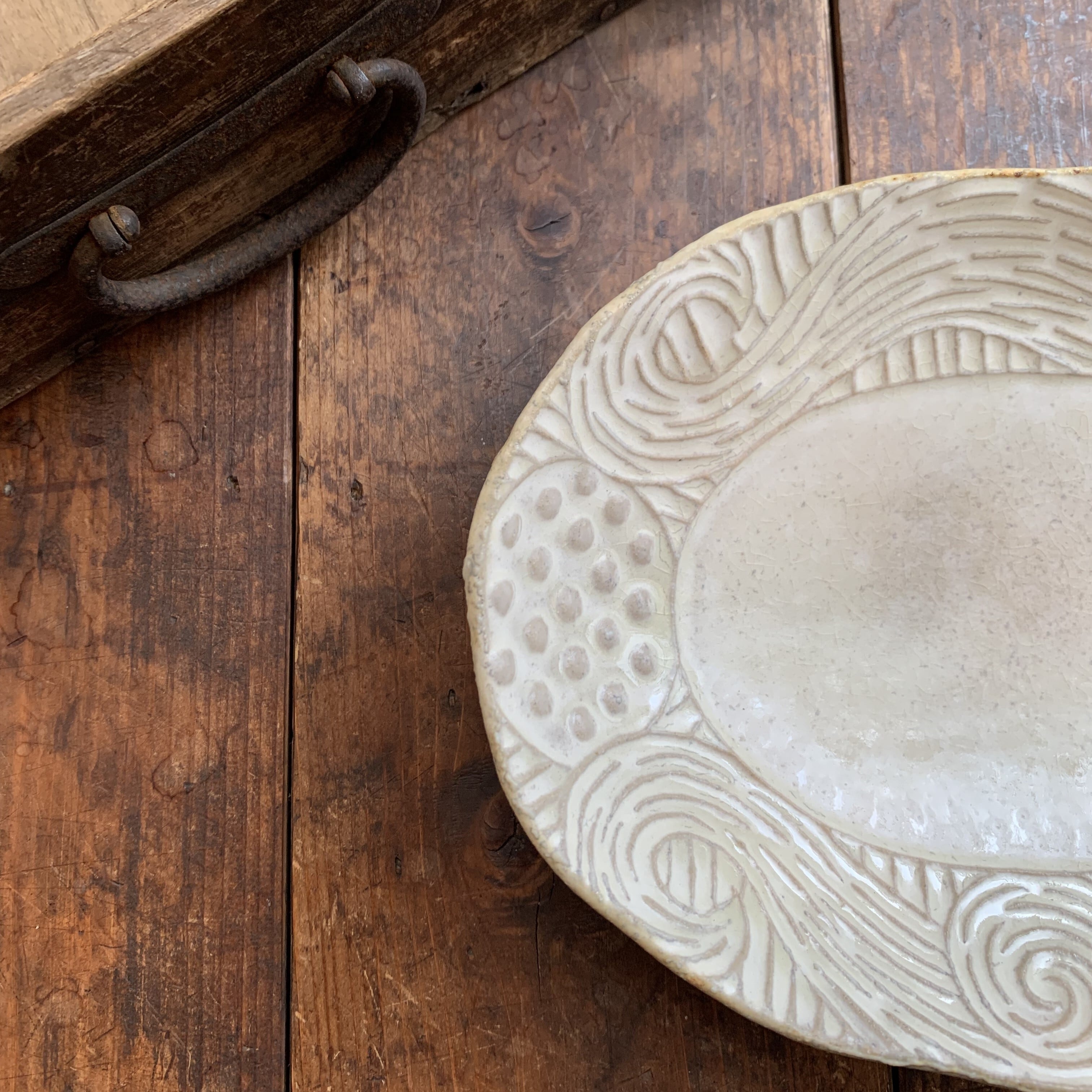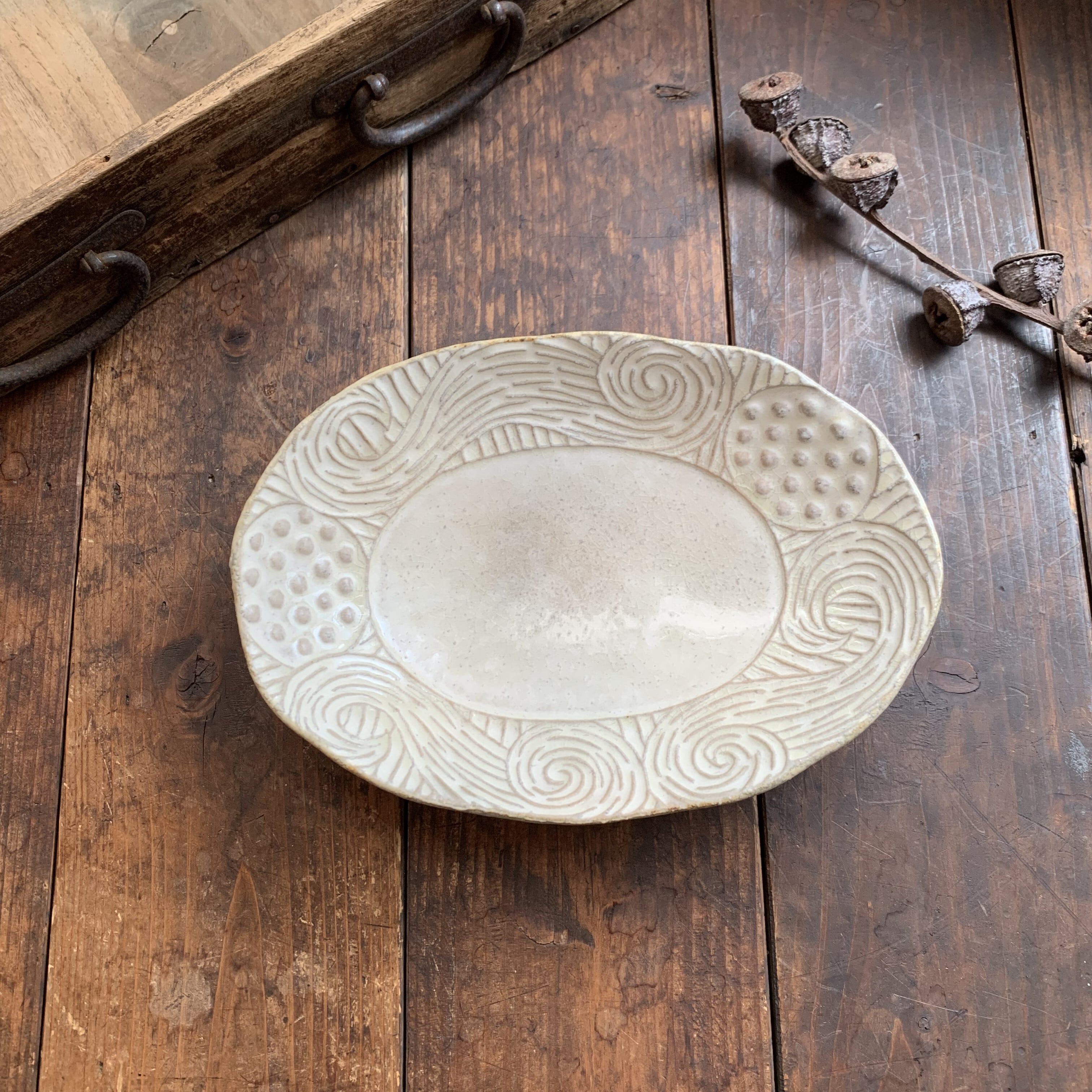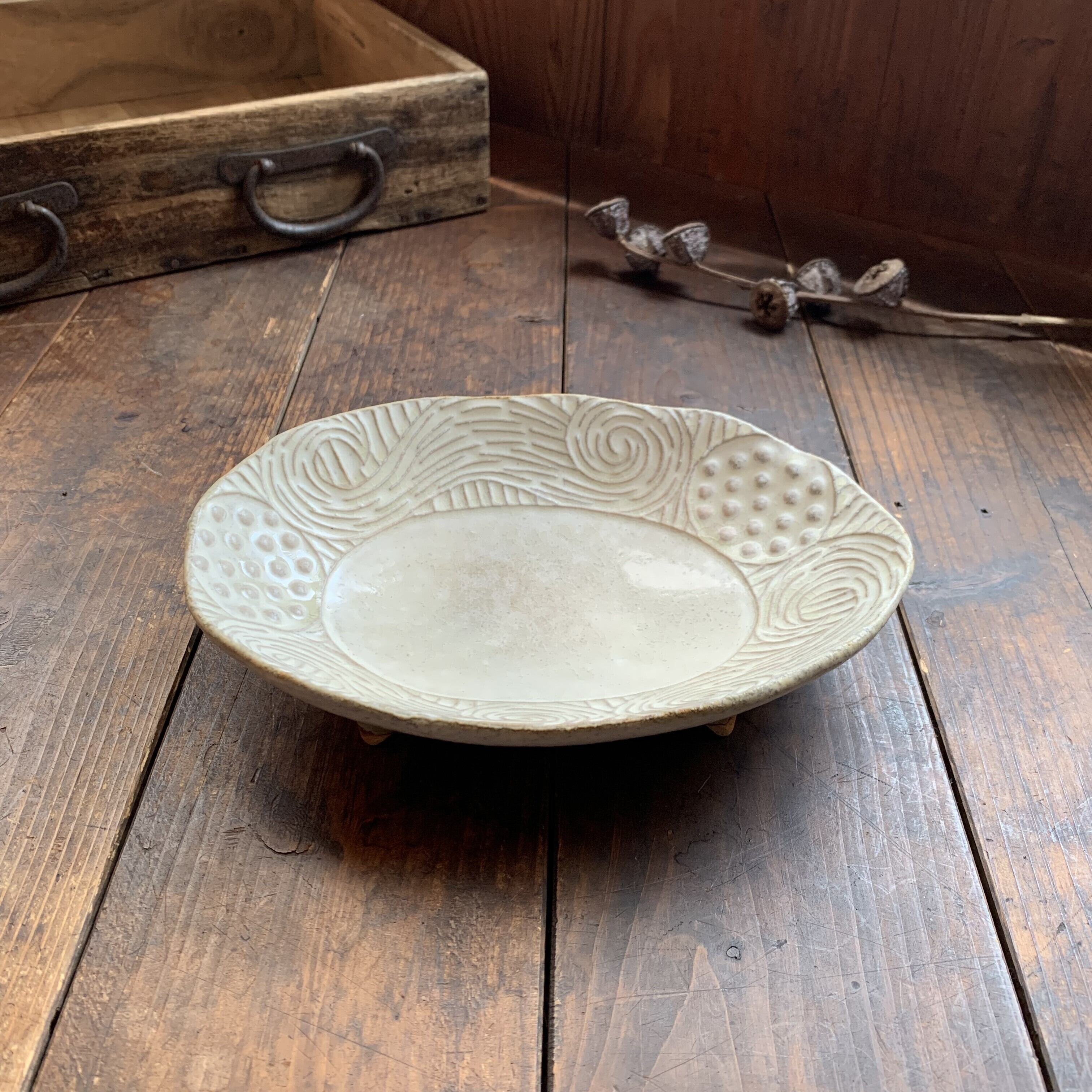 佐藤りぢゅう氏の刻文デザインが美しい足付き楕円鉢です。素朴なアイボリーの色合いに、オリジナルの刻文柄が個性と温かみを与えてくれます。底にはかわいい足が4つ付いていて、とてもおしゃれです。深みがあるのでどんなお料理も盛り付けることができます。