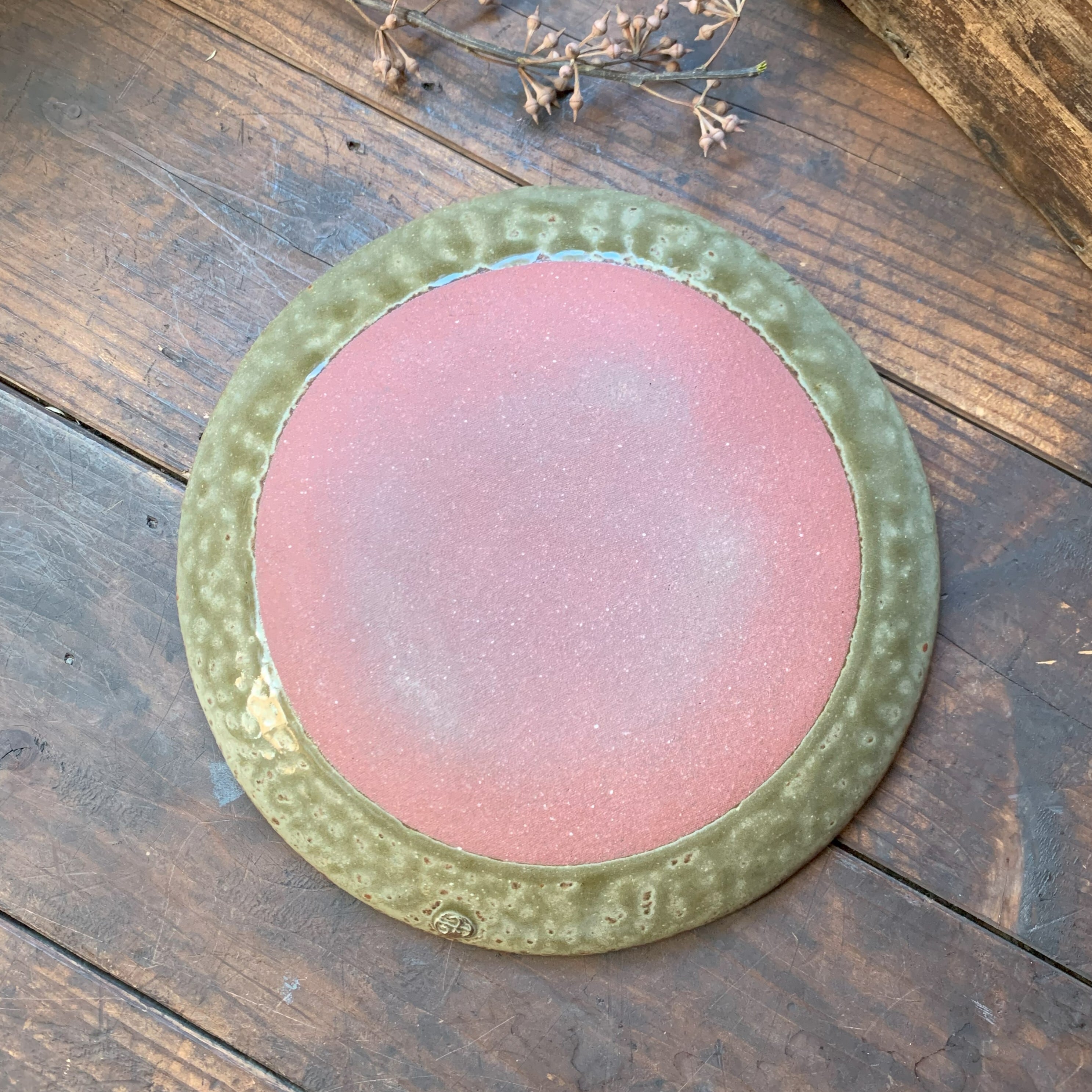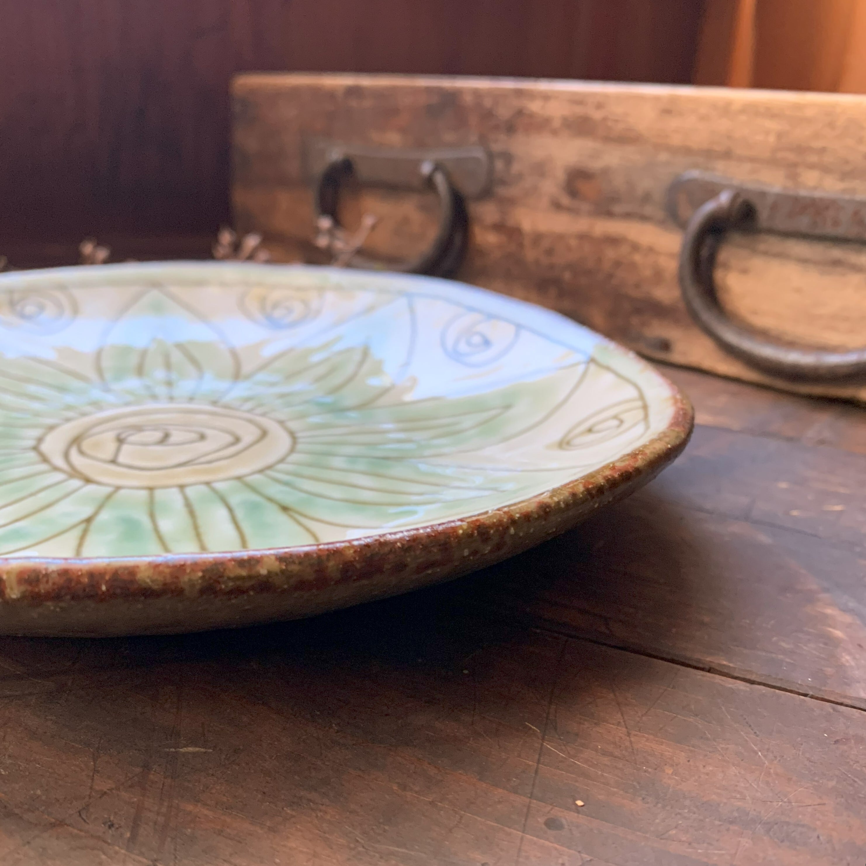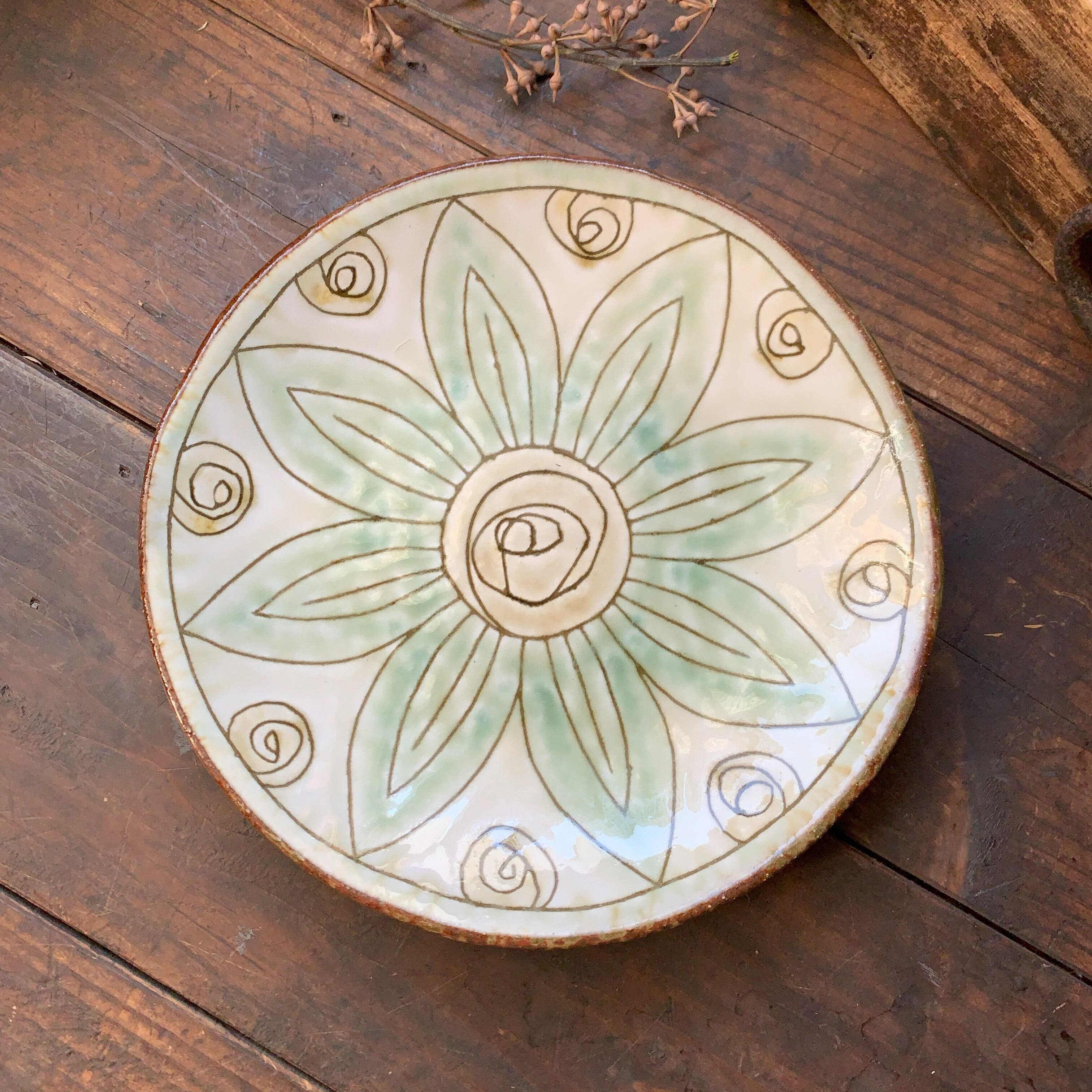 掻き落としという伝統的な技法で作られたお皿です。りぢゅう氏オリジナルの温もりあふれる絵柄がとても個性的です。光沢のあるアイボリー色と淡い緑色が優しい雰囲気を醸し出しています。手作りならではの、色合いと柄が素敵なお皿です。