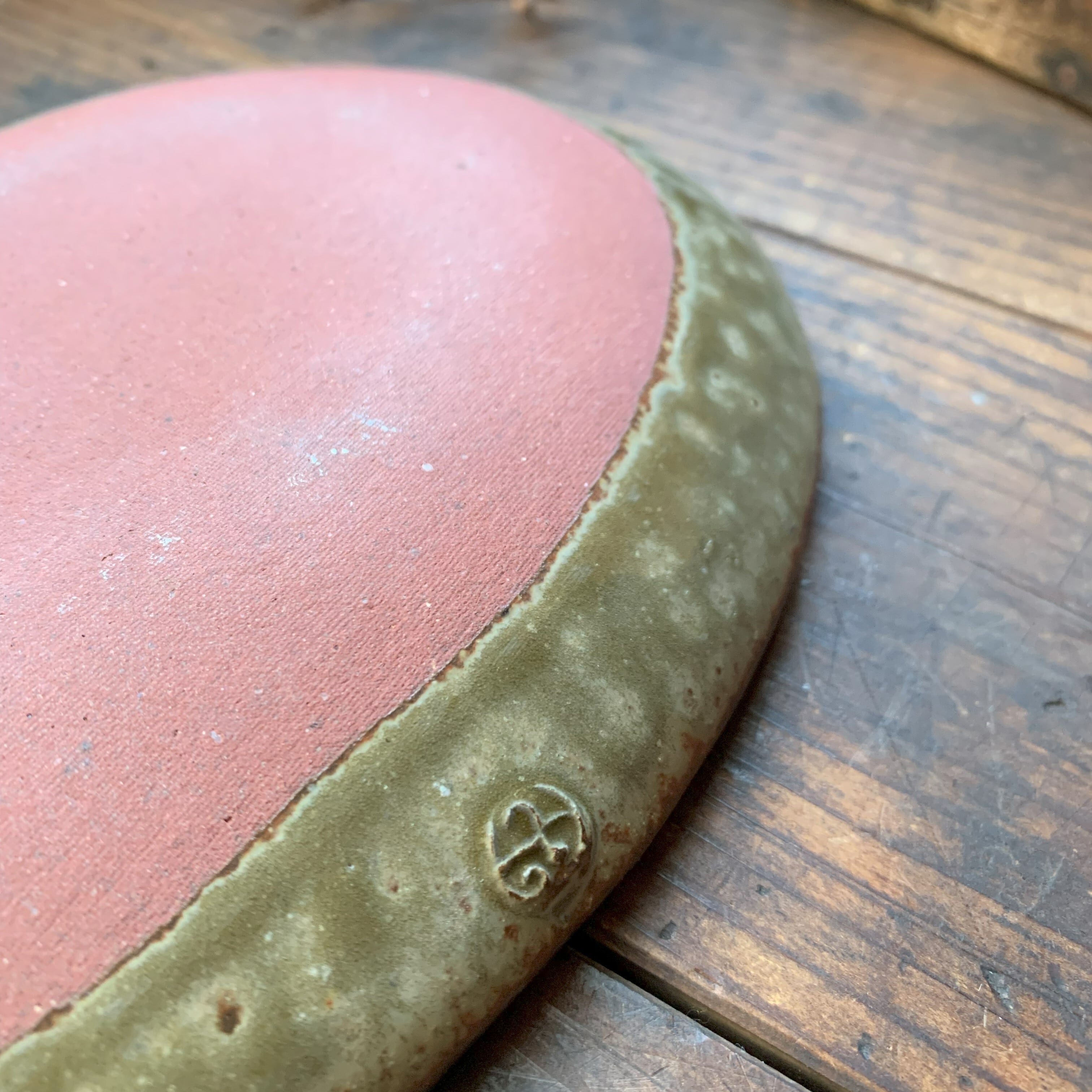 こちらは、掻き落としという伝統的な技法で作られたお皿です。りぢゅう氏オリジナルの温もりあふれる絵柄がとても個性的です。光沢のあるアイボリー色と淡い緑色が優しい雰囲気を醸し出しています。手作りならではの、色合いと柄が素敵なお皿です。