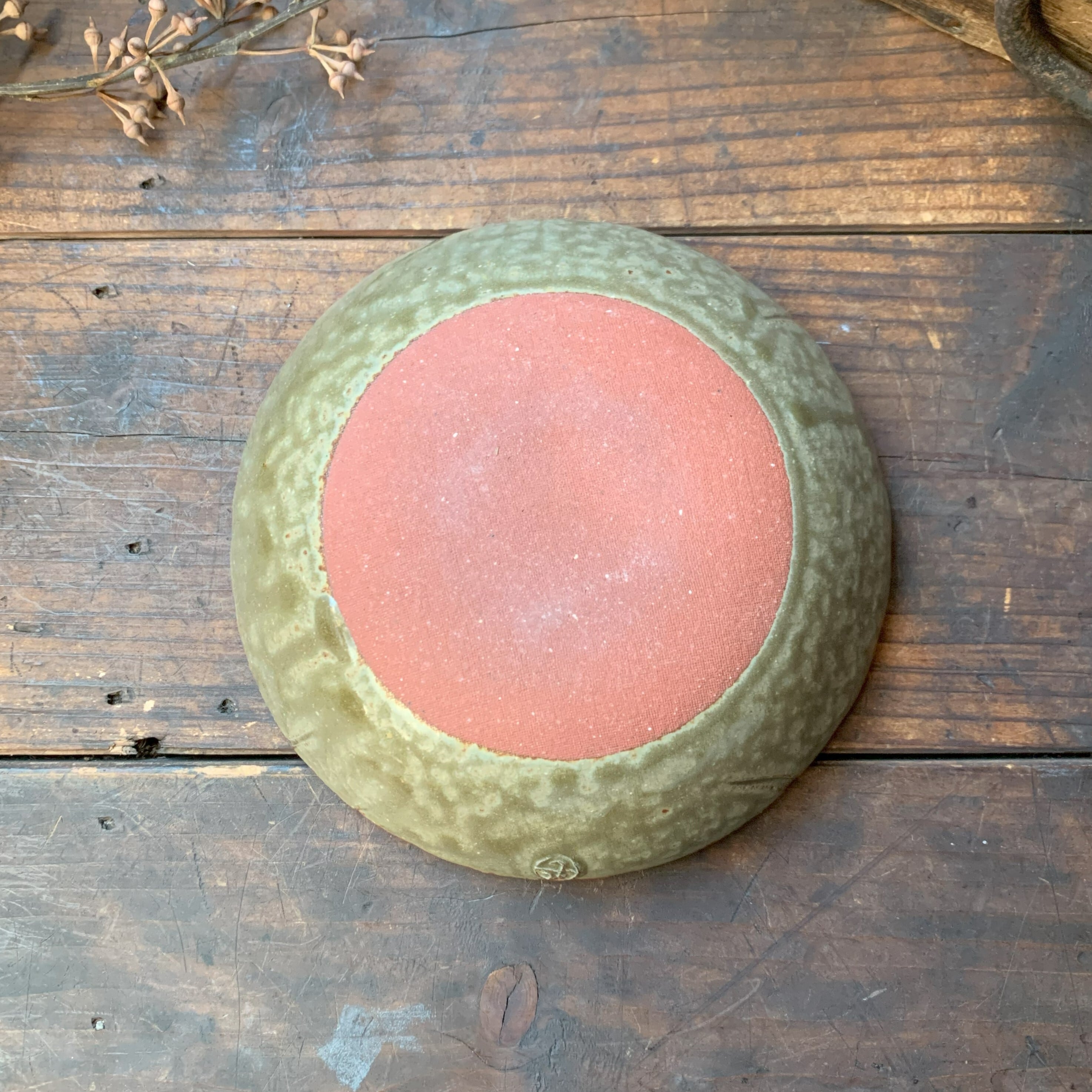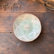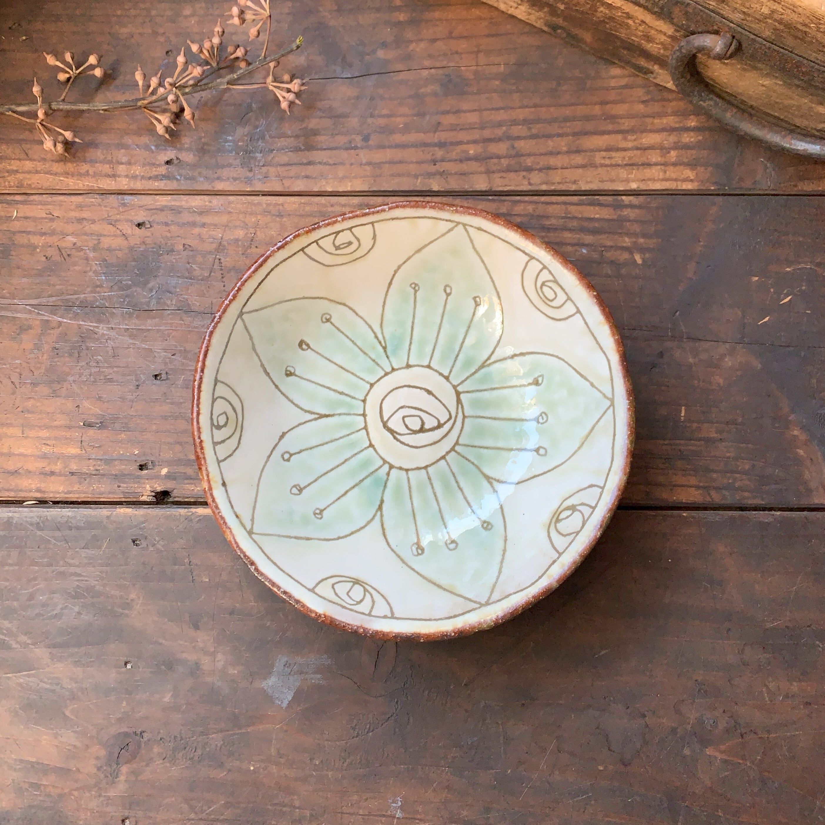 こちらは、掻き落としという伝統的な技法で作られたお皿です。りぢゅう氏オリジナルの温もりあふれる絵柄がとても個性的です。光沢のあるアイボリー色と淡い緑色が優しい雰囲気を醸し出しています。手作りならではの、色合いと柄が素敵なお皿です。