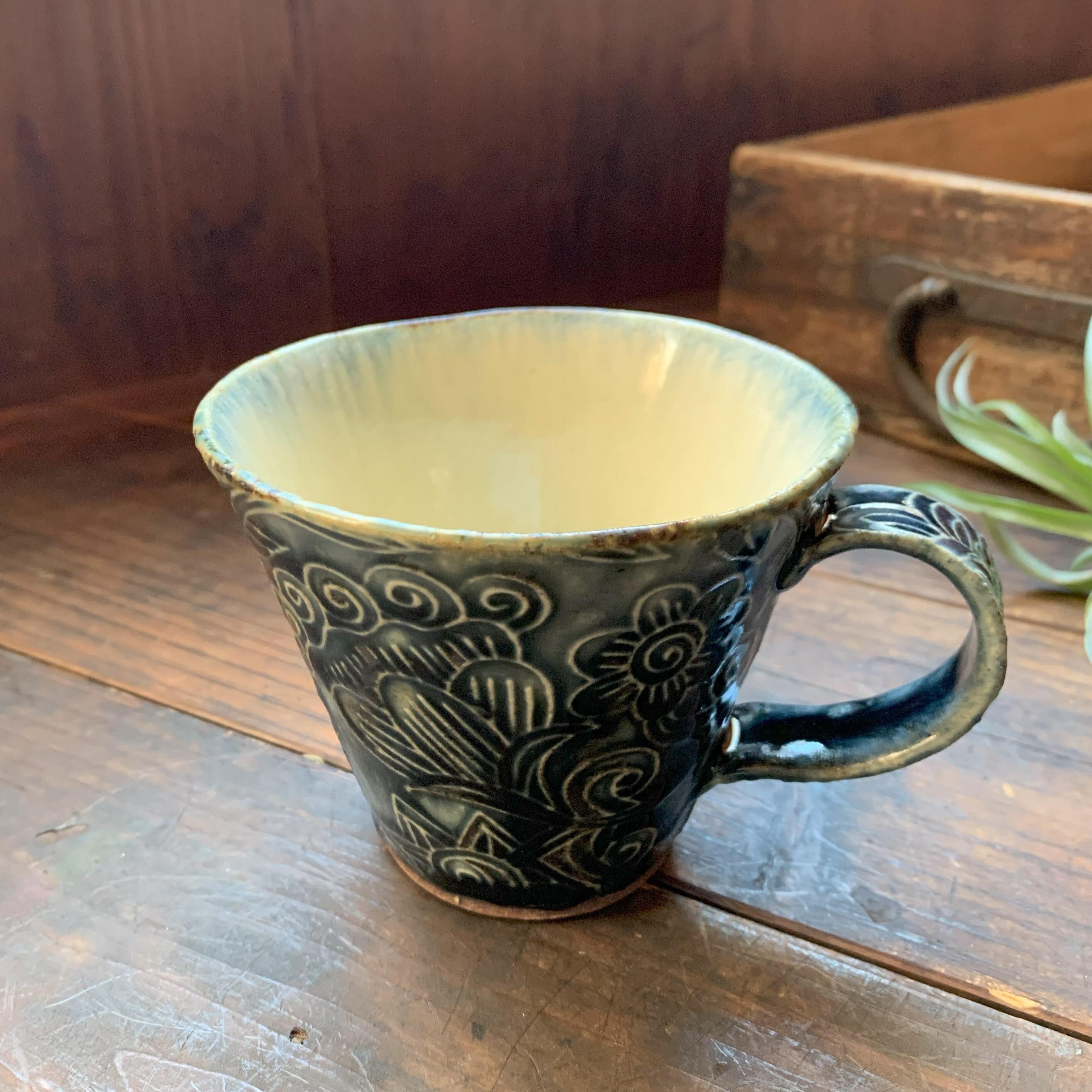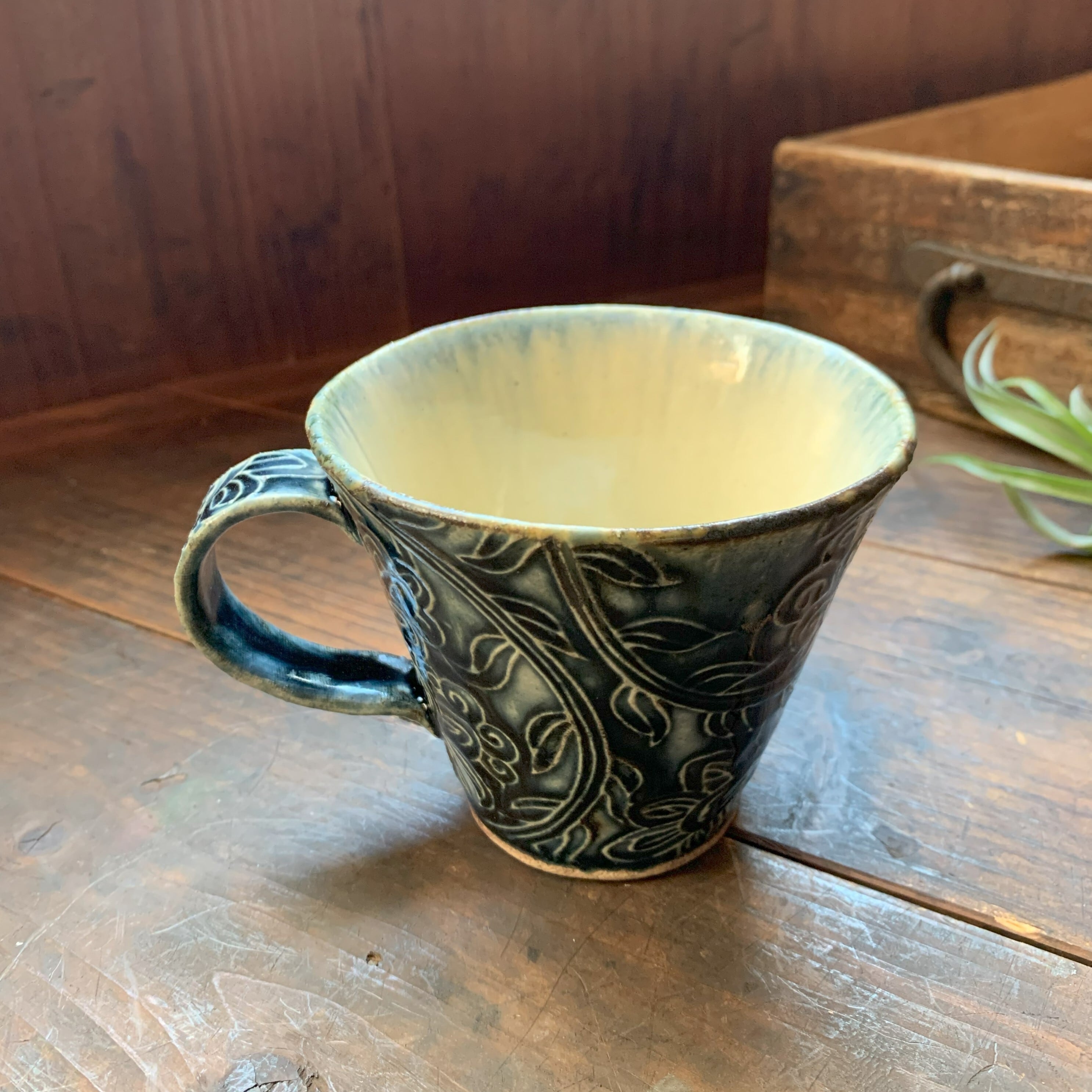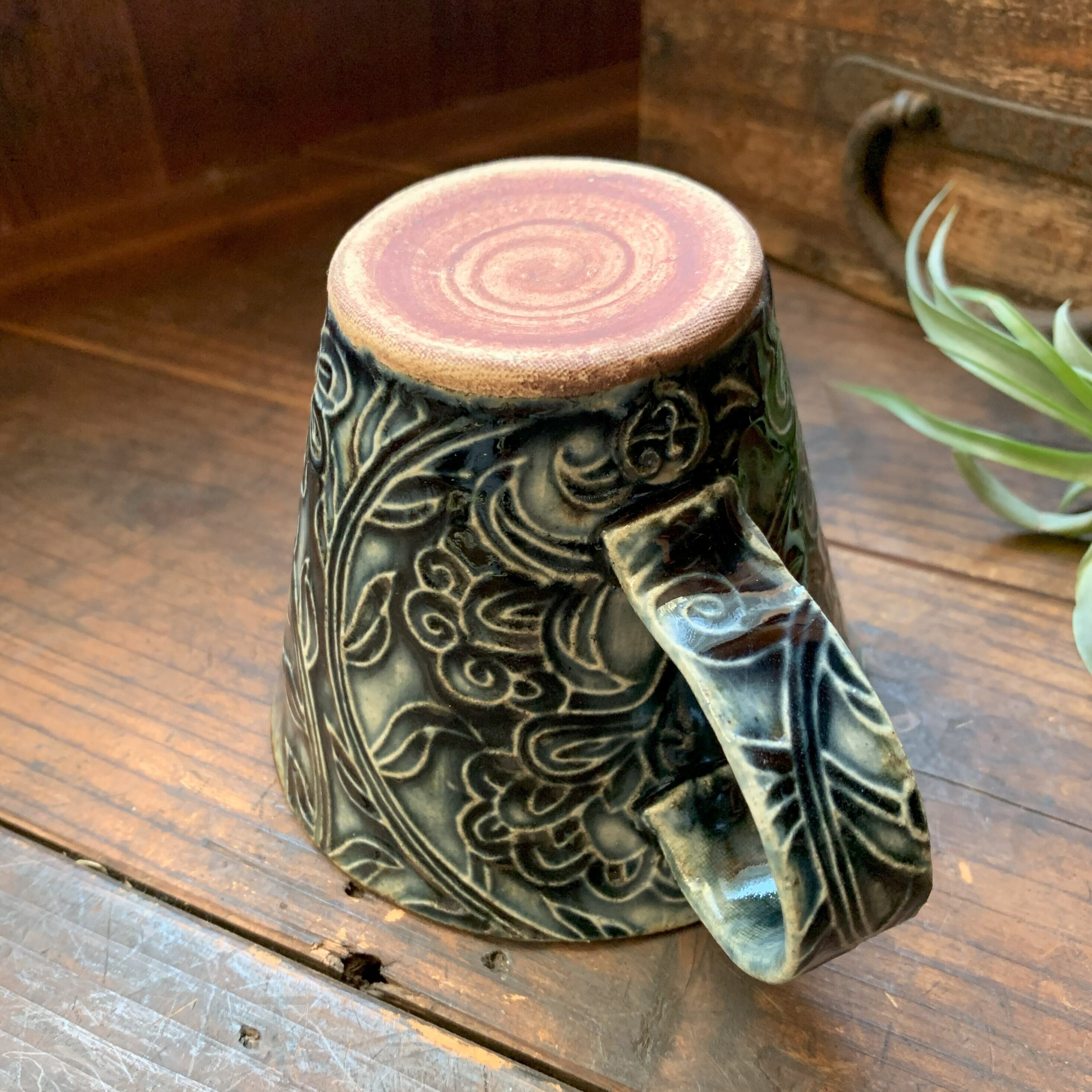 黒に近い深い藍色釉に、個性的な草の刻文が素敵なマグカップです。