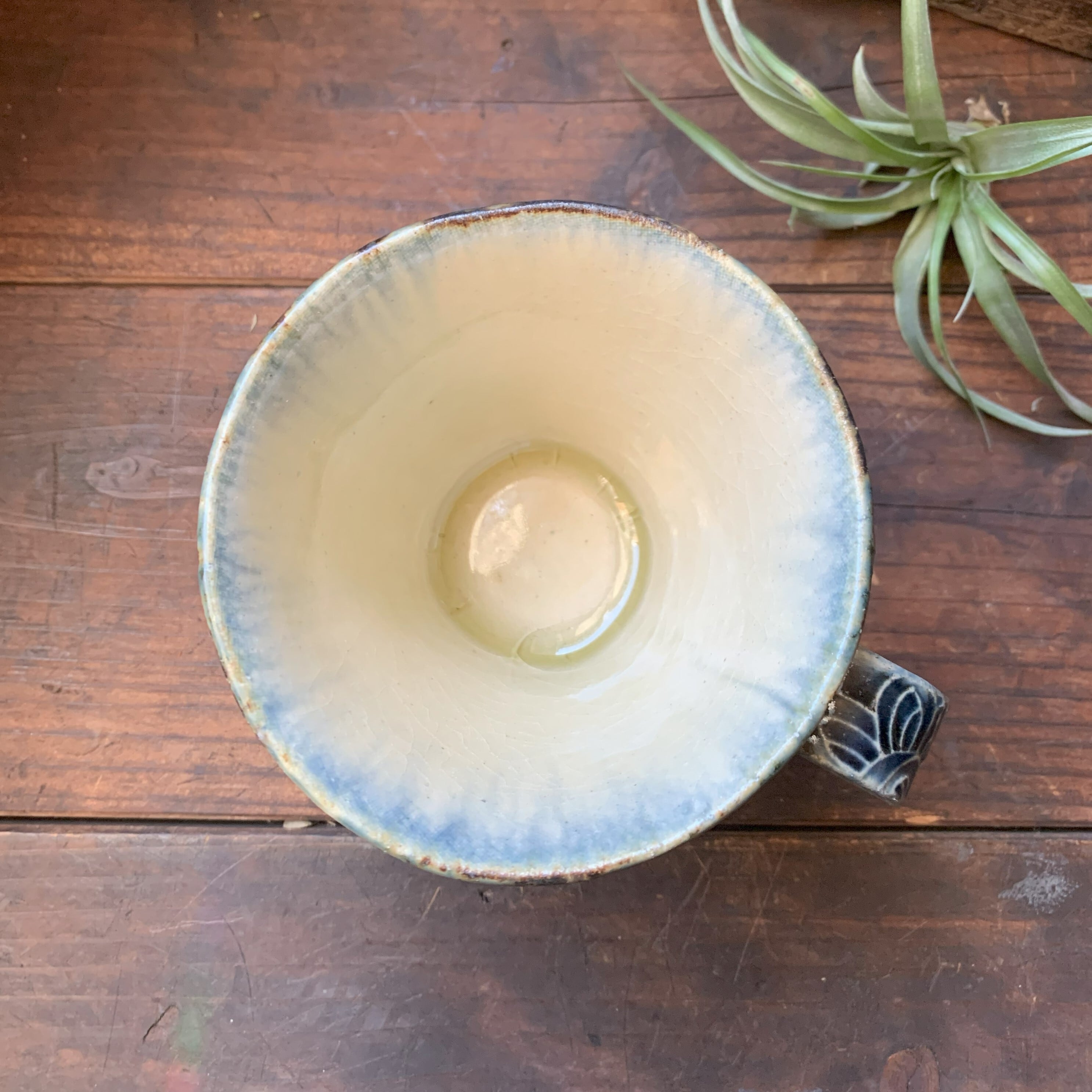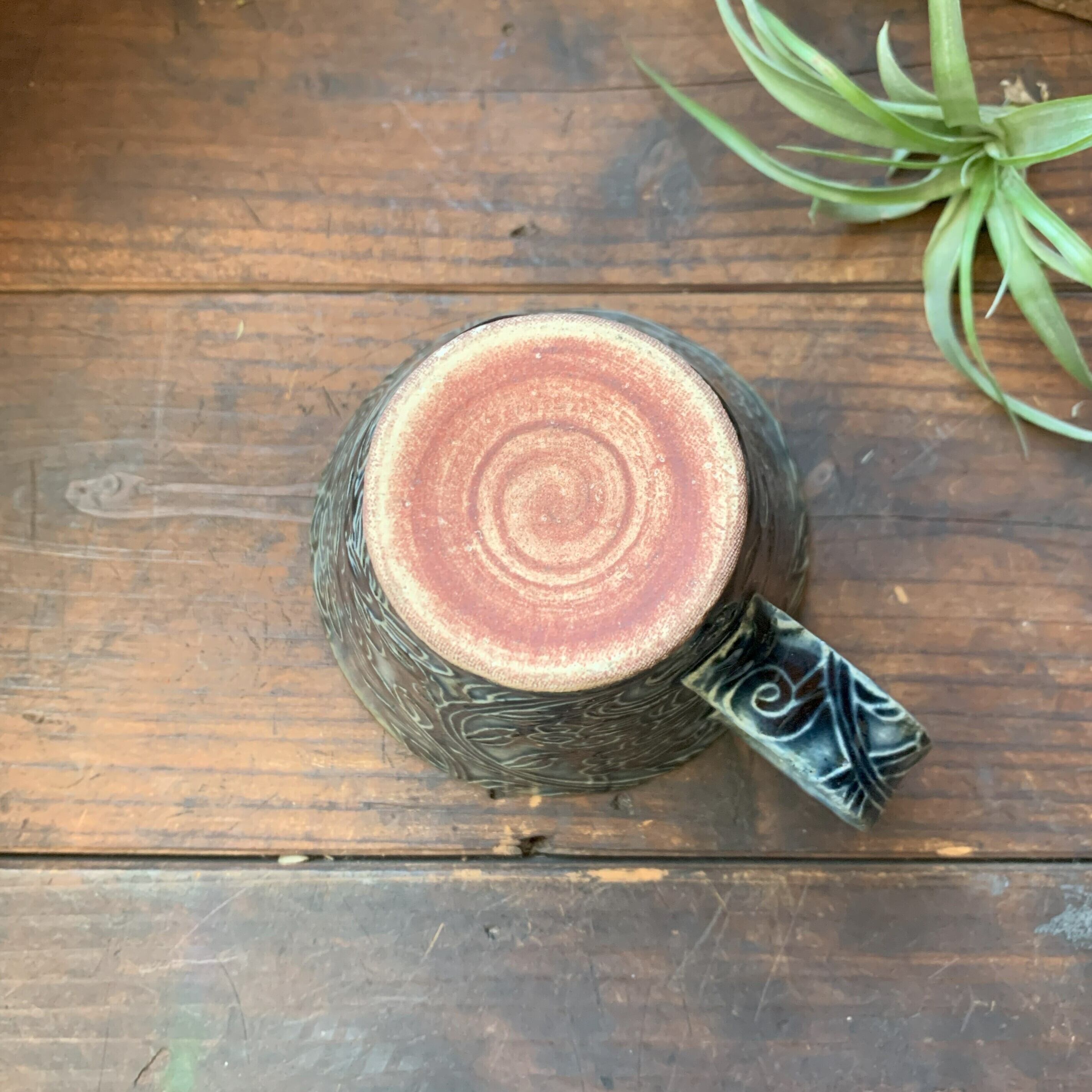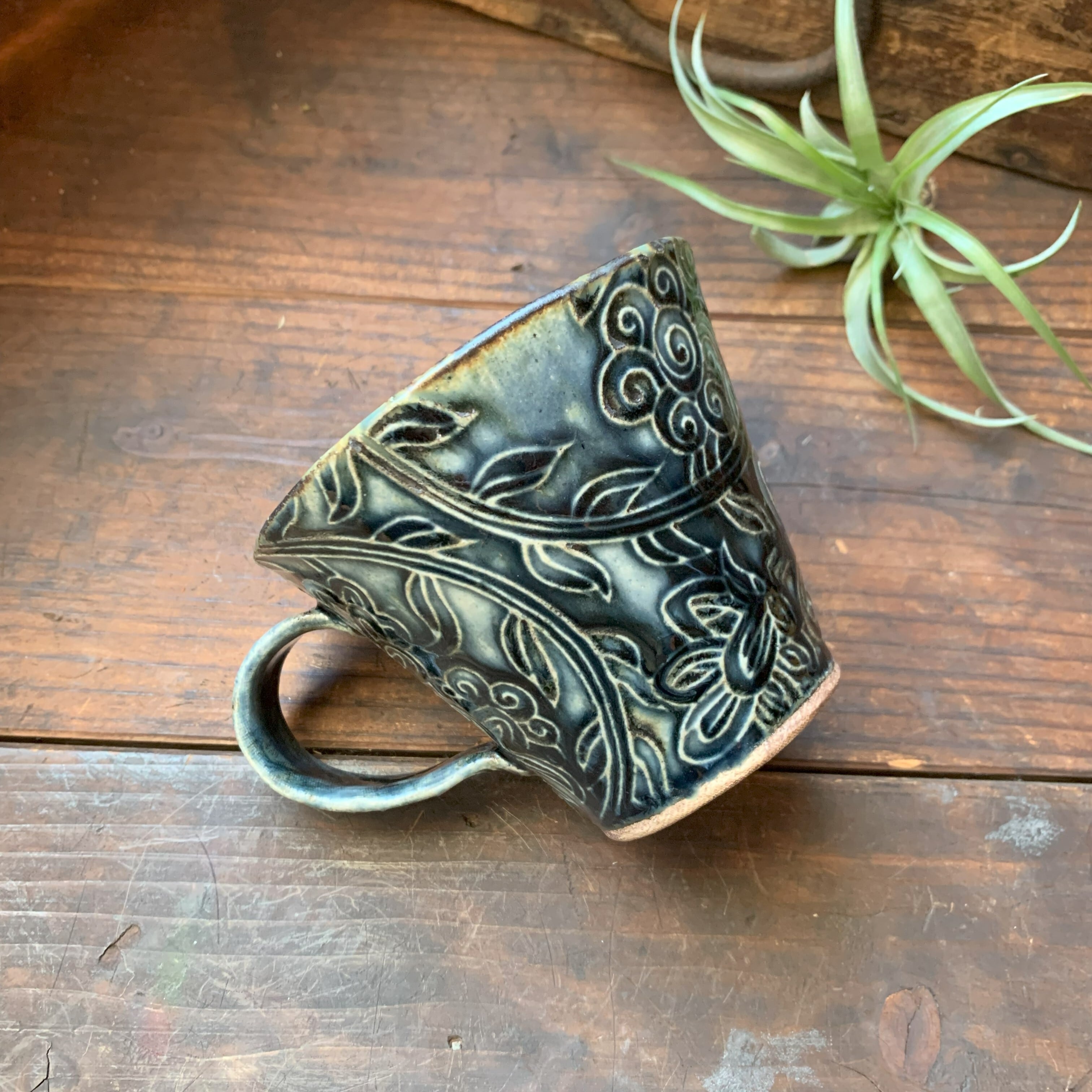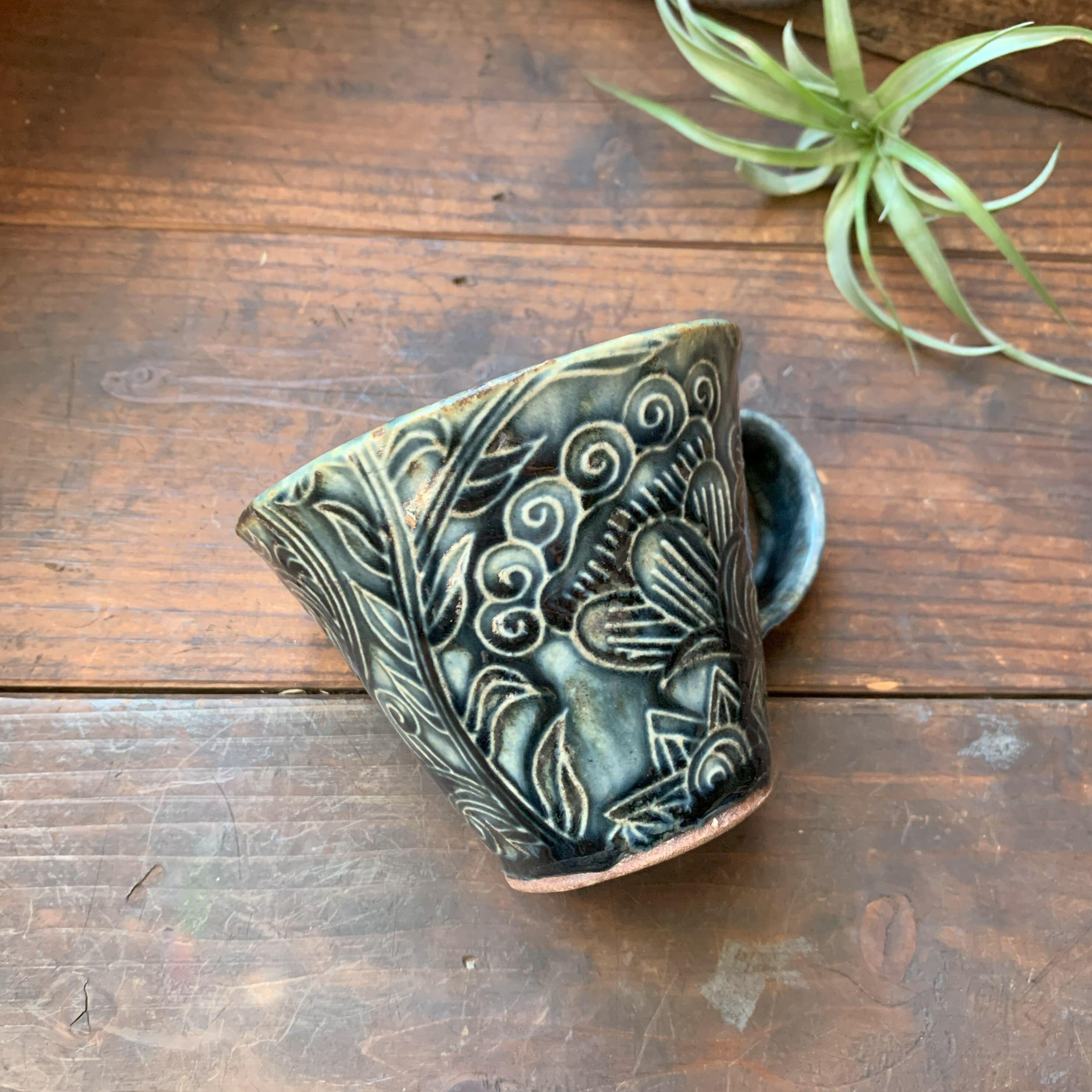 黒に近い深い藍色釉に、個性的な草の刻文が素敵なマグカップです。