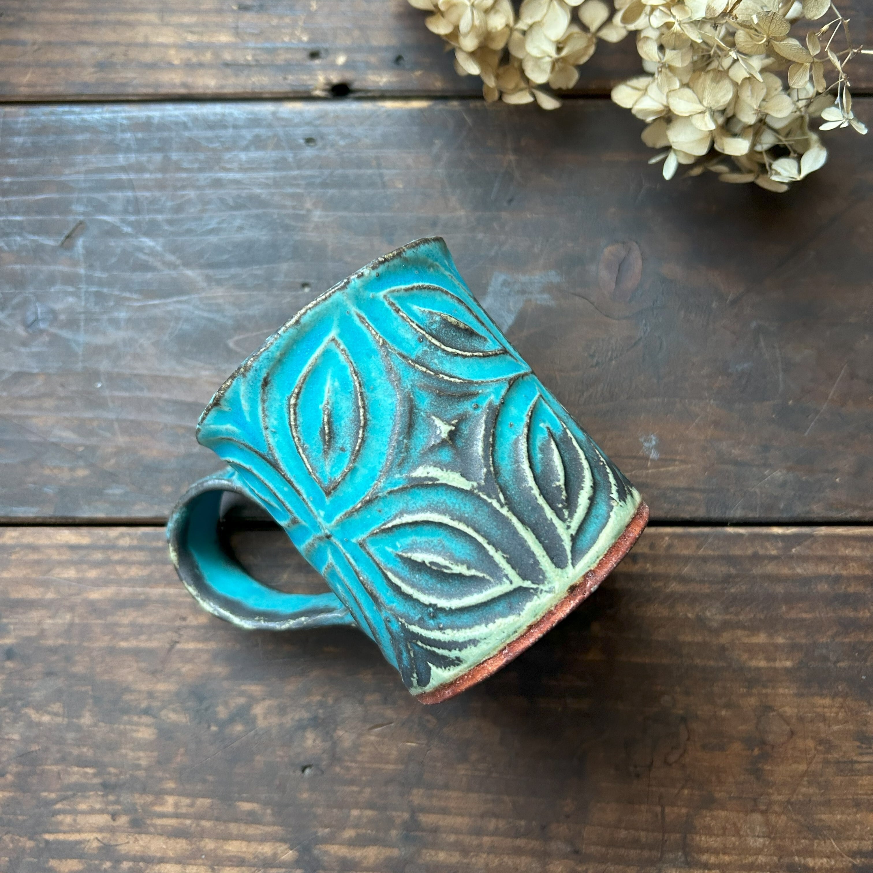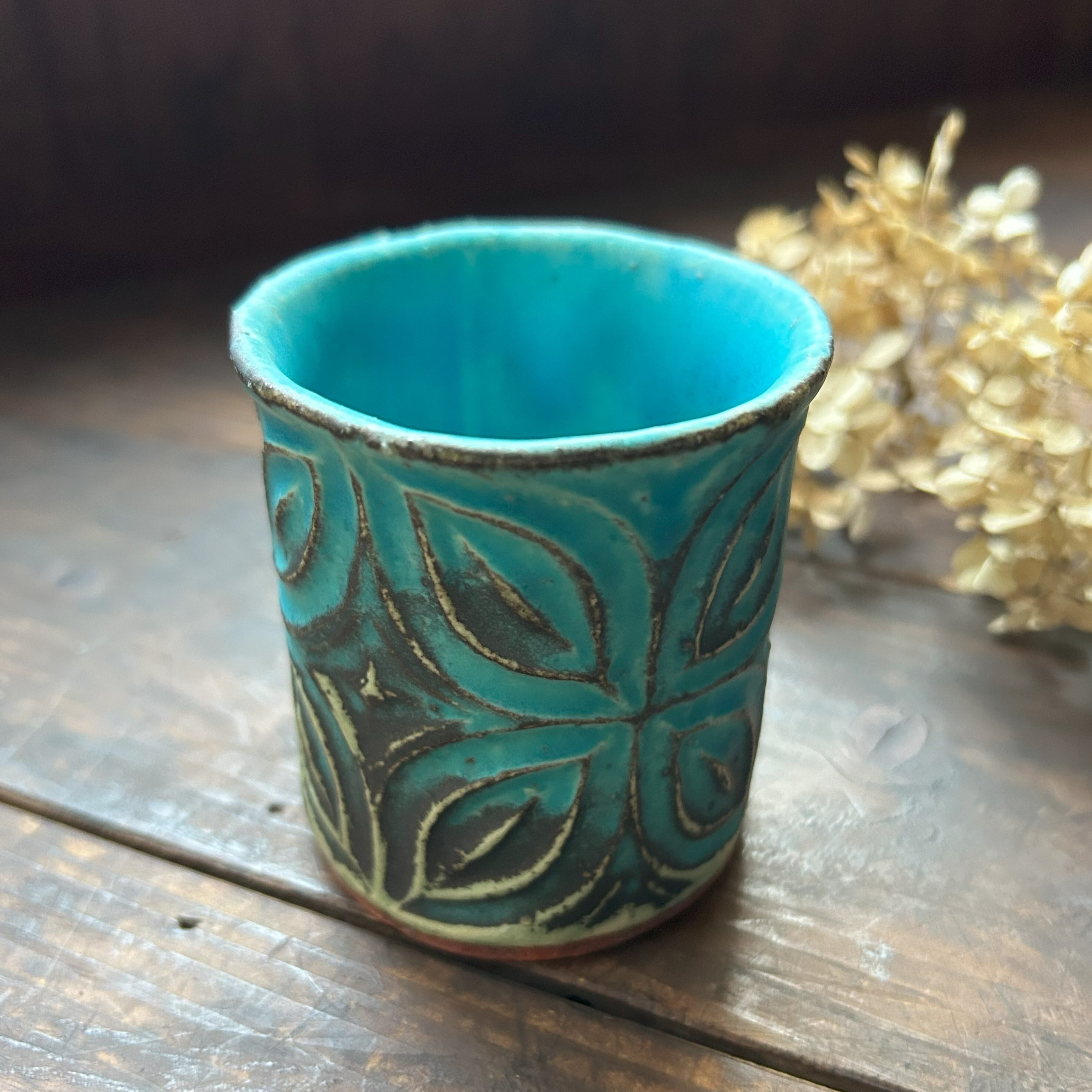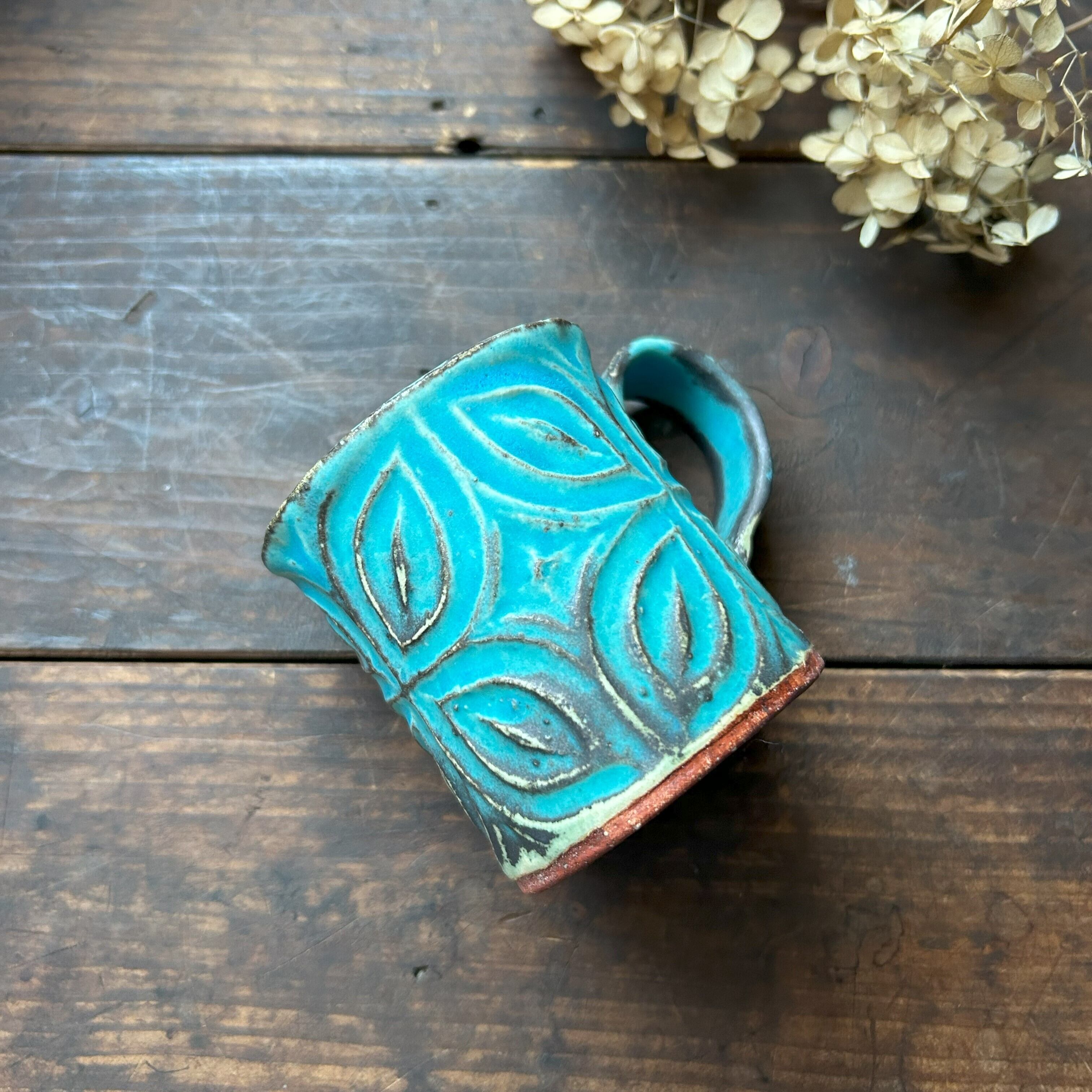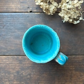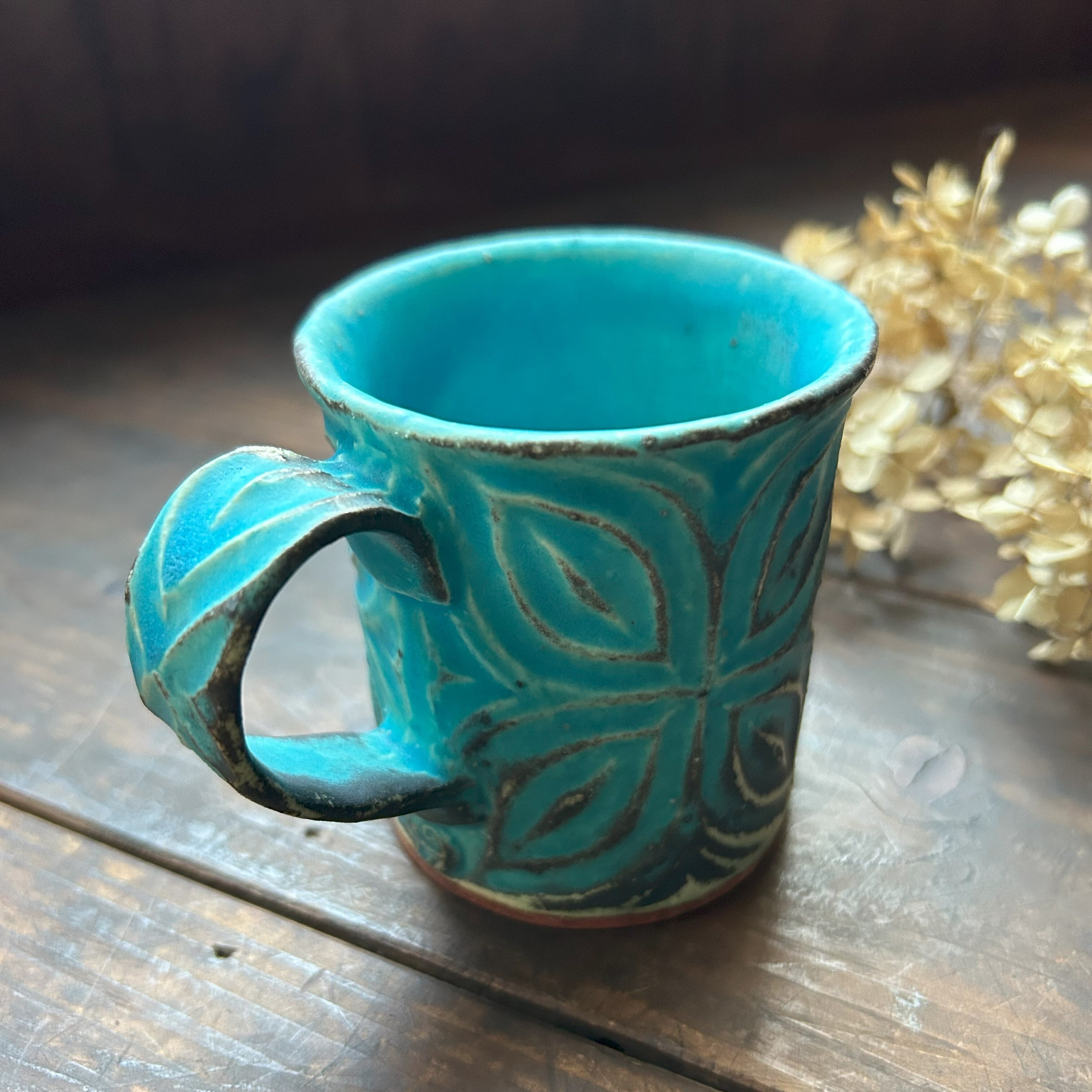 きれいなターコイズブルーに個性豊かな刻文の入ったカップです。やや小ぶりなサイズです。コーヒーを入れると、さらに絵になるかっこいいカップです。