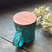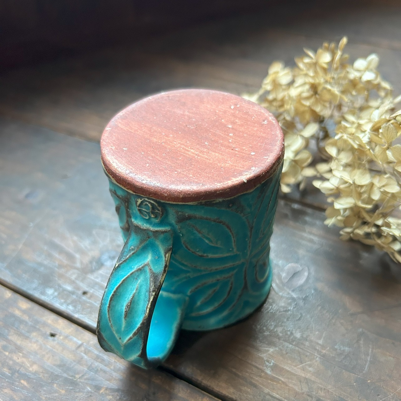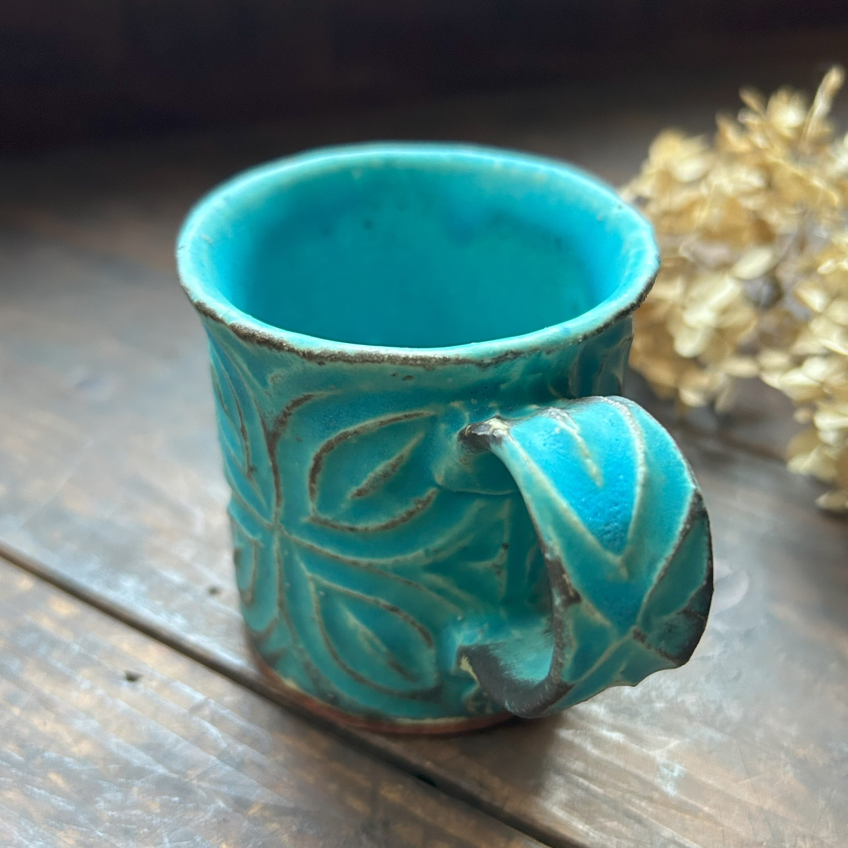 【笠間焼】 佐藤りぢゅう レリーフカップ(葉っぱ)7.2cm ターコイズ