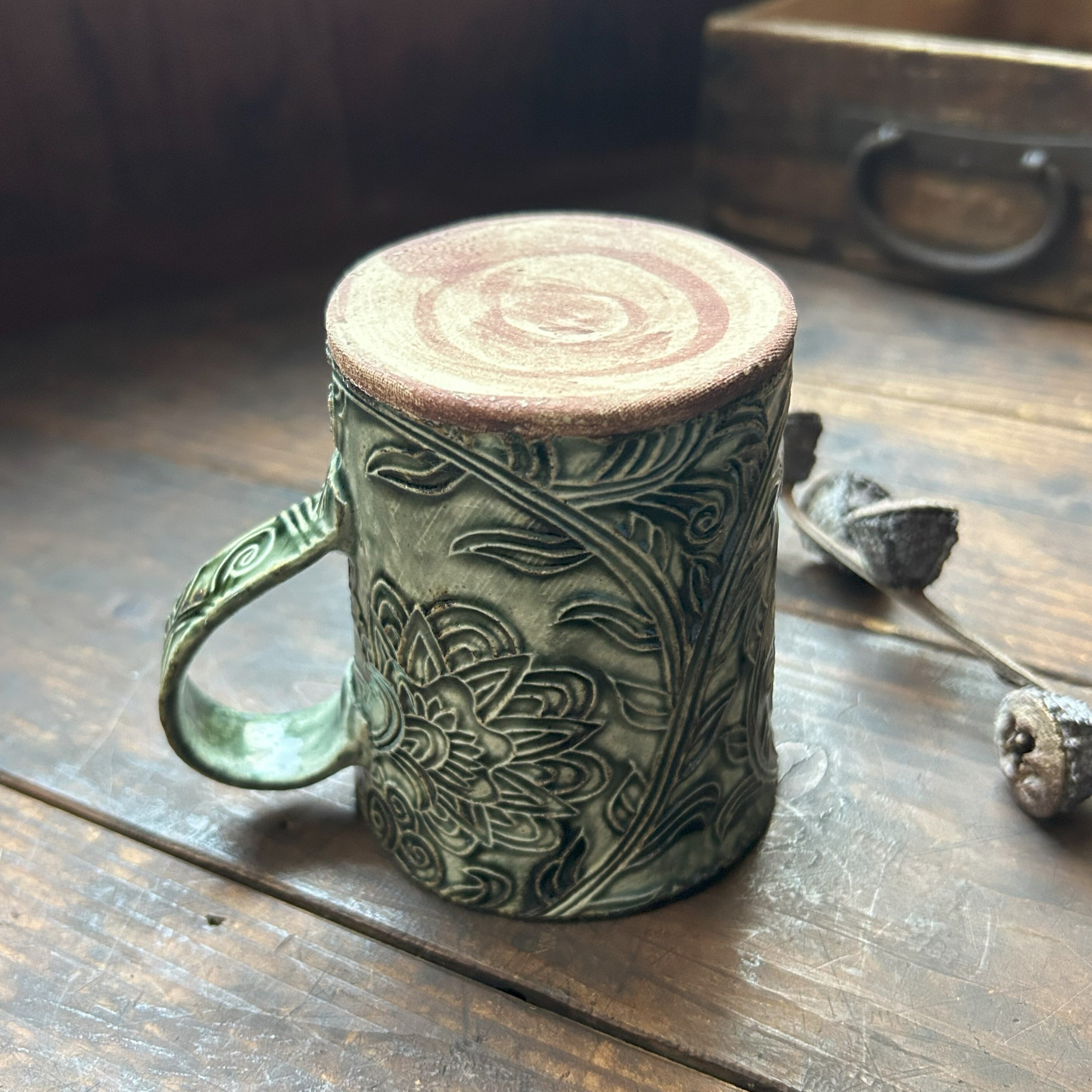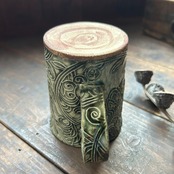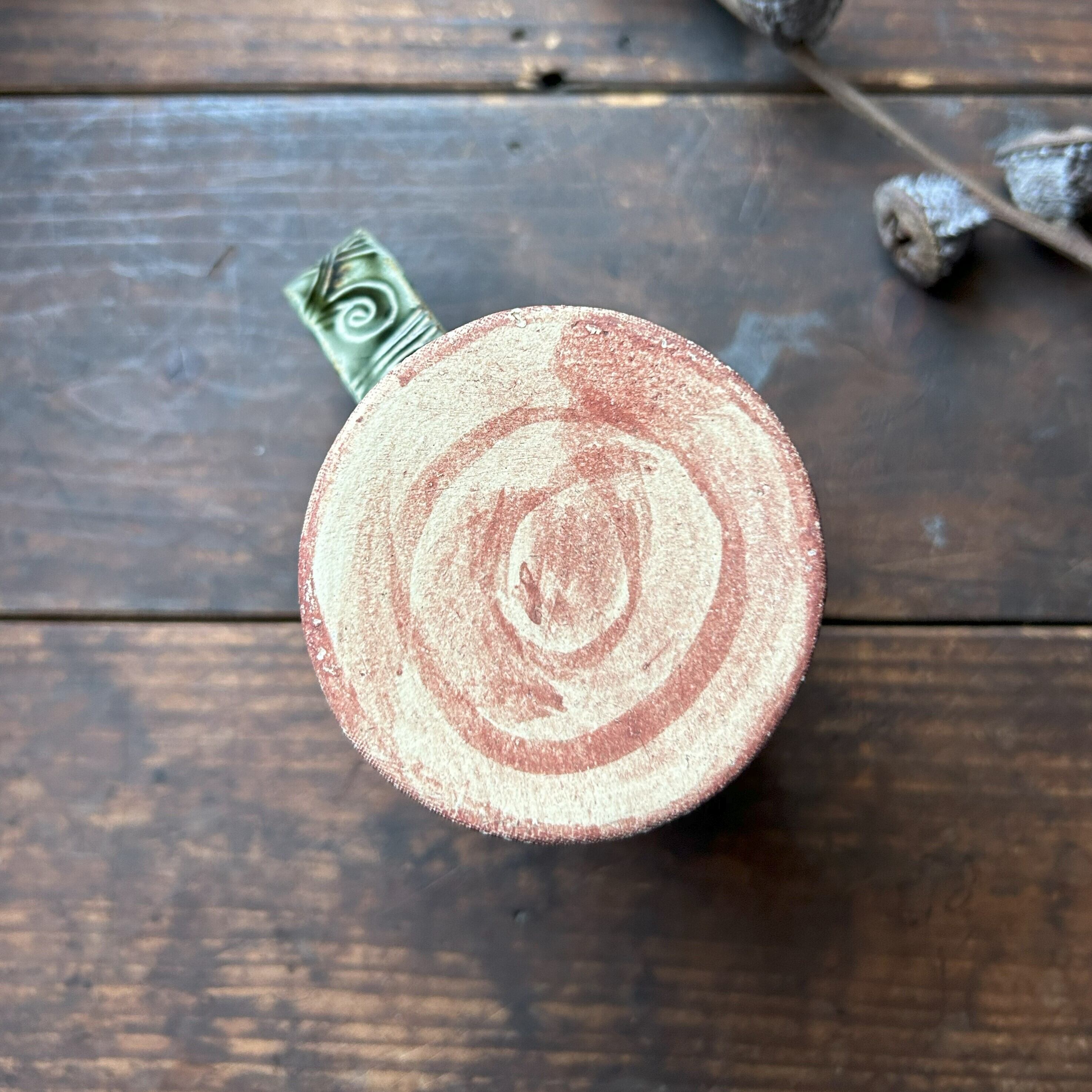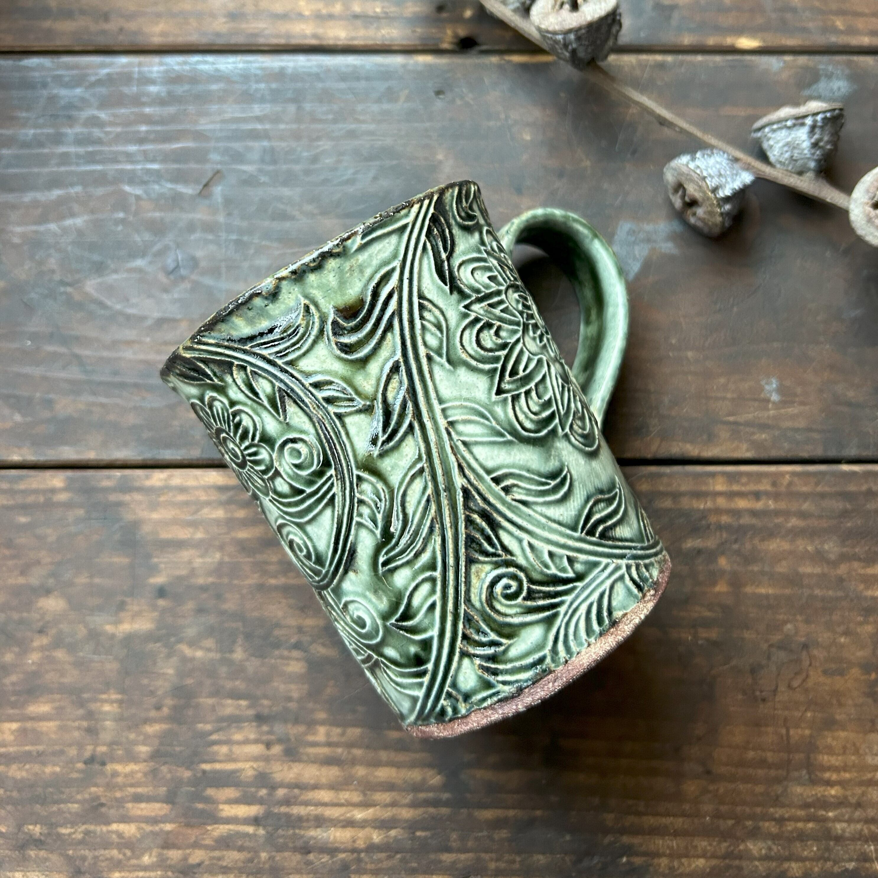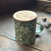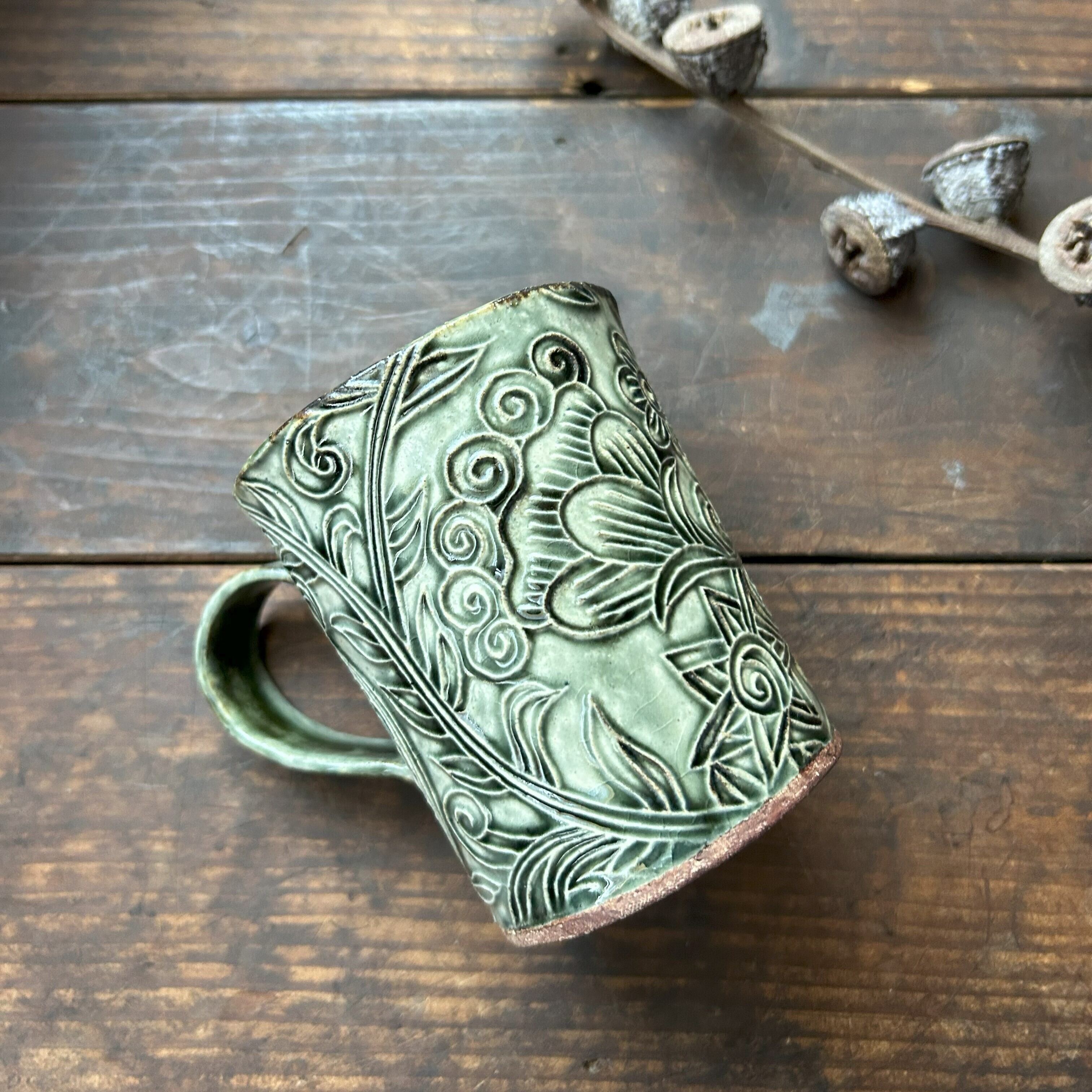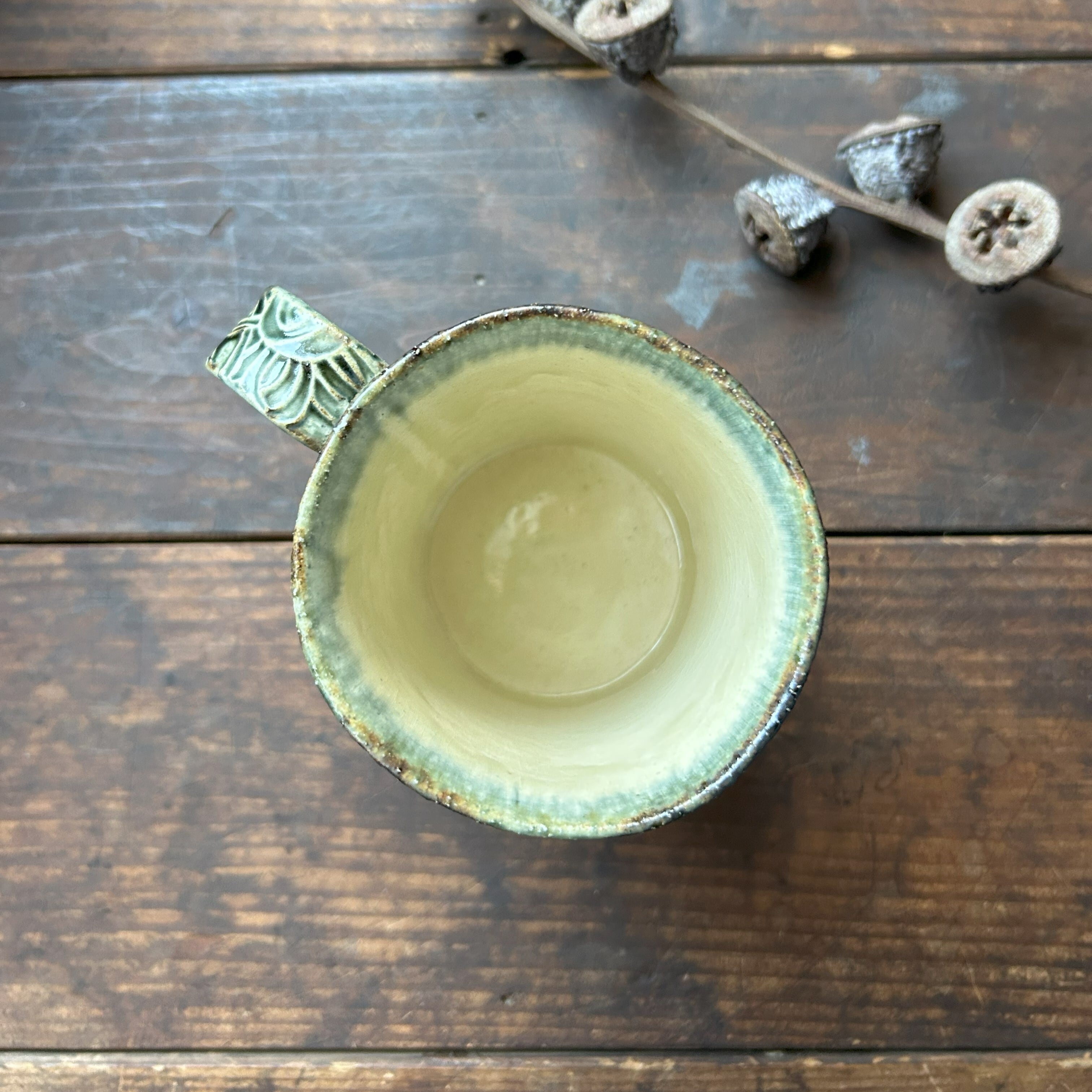 個性的な草の刻文が素敵な緑灰釉のマグカップです。光沢感があります。