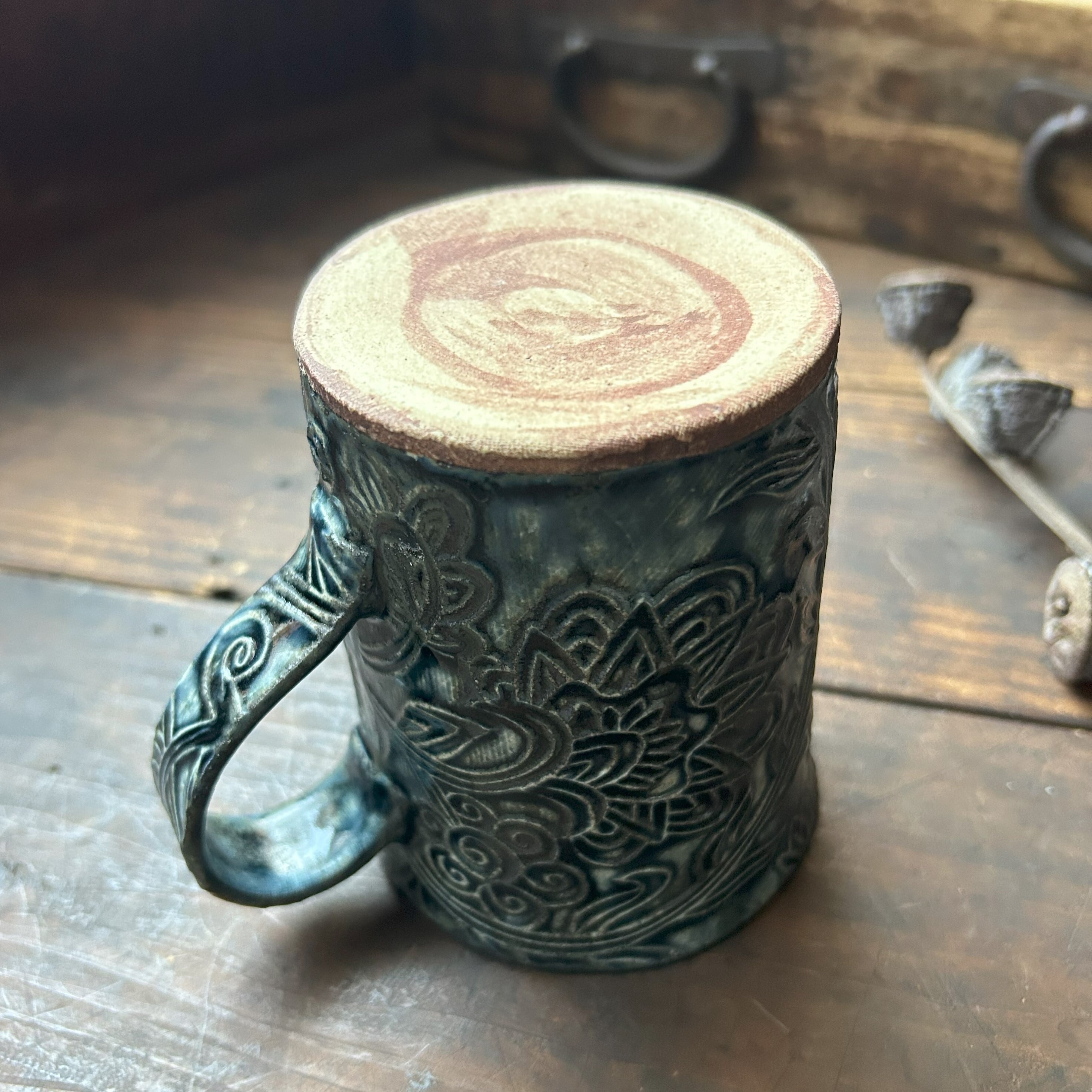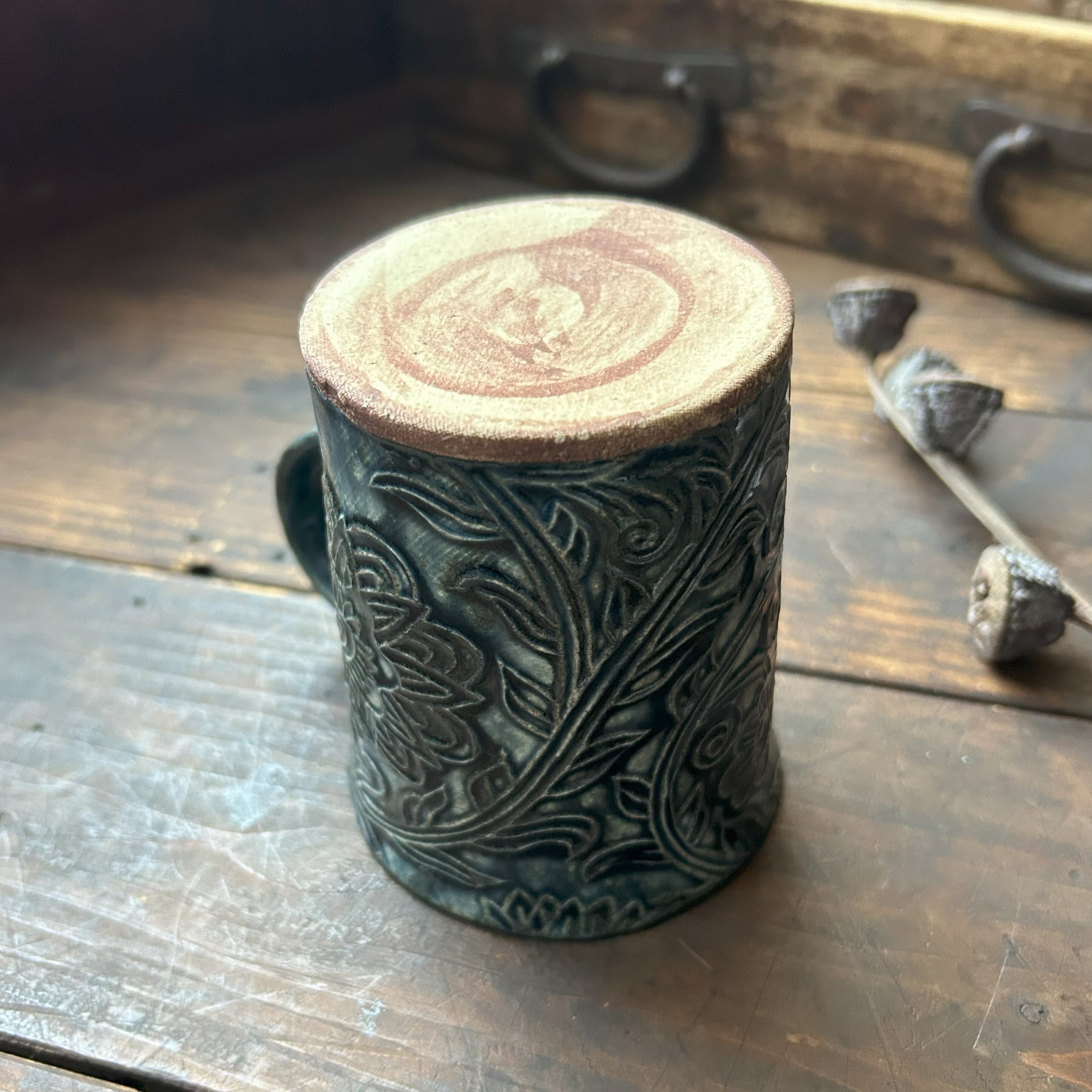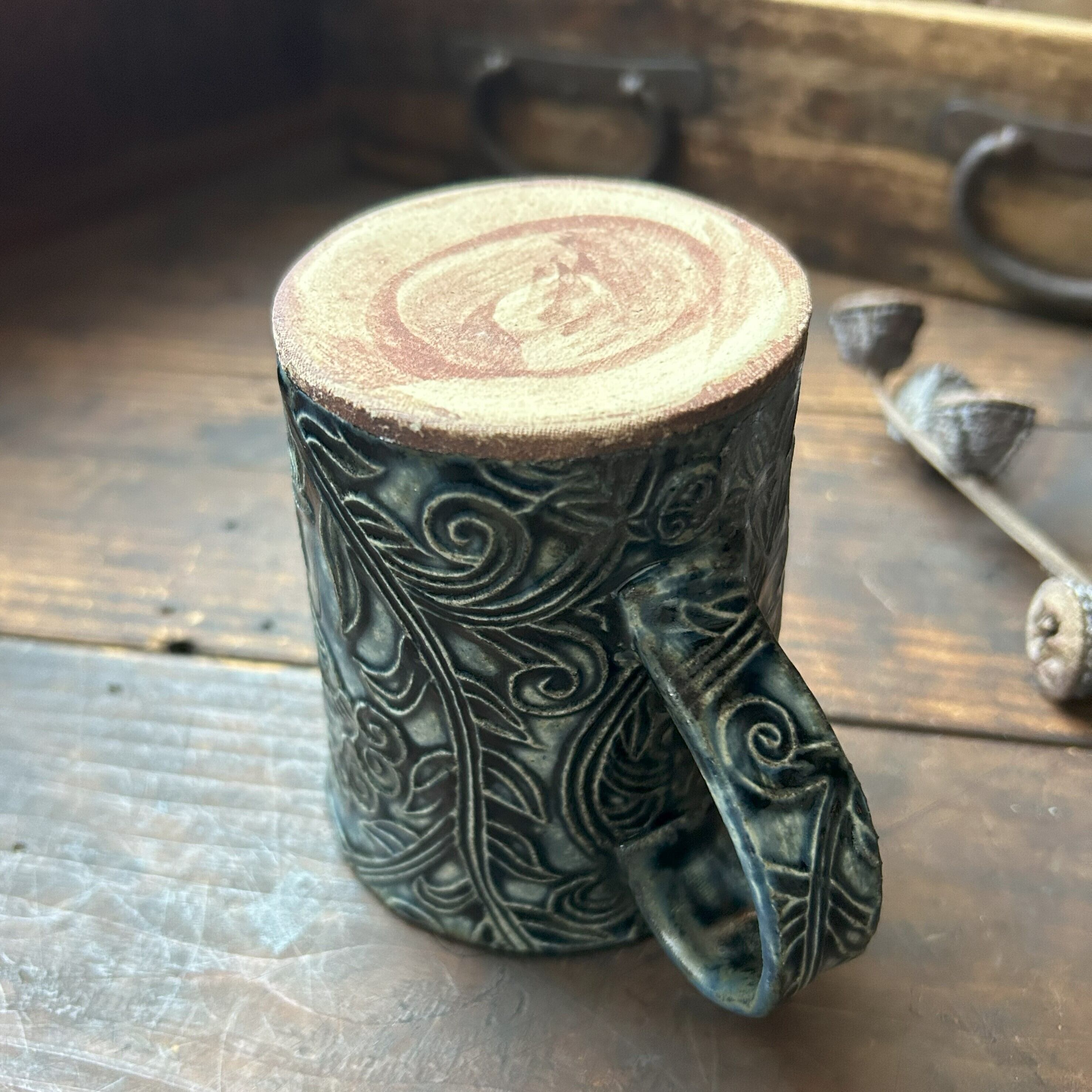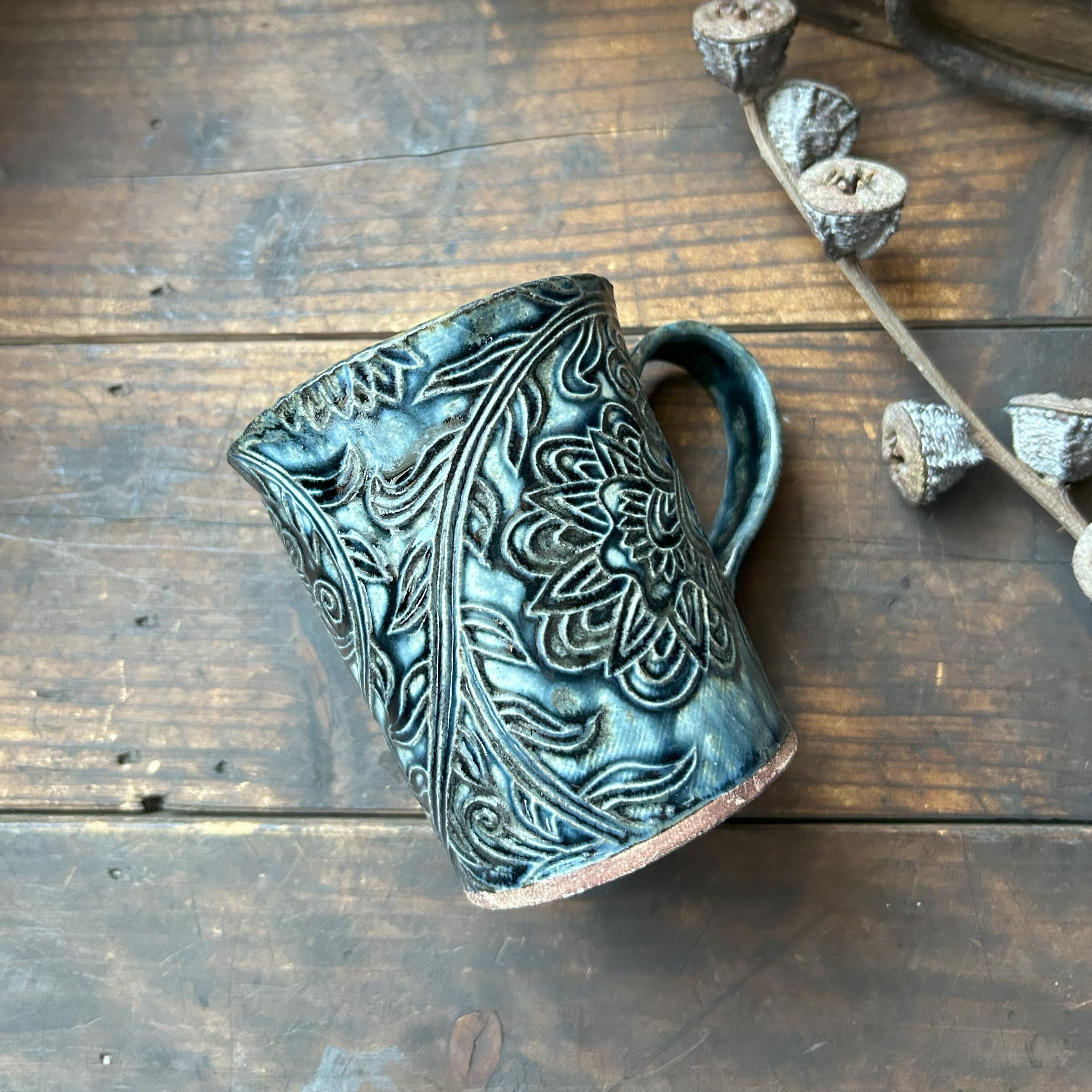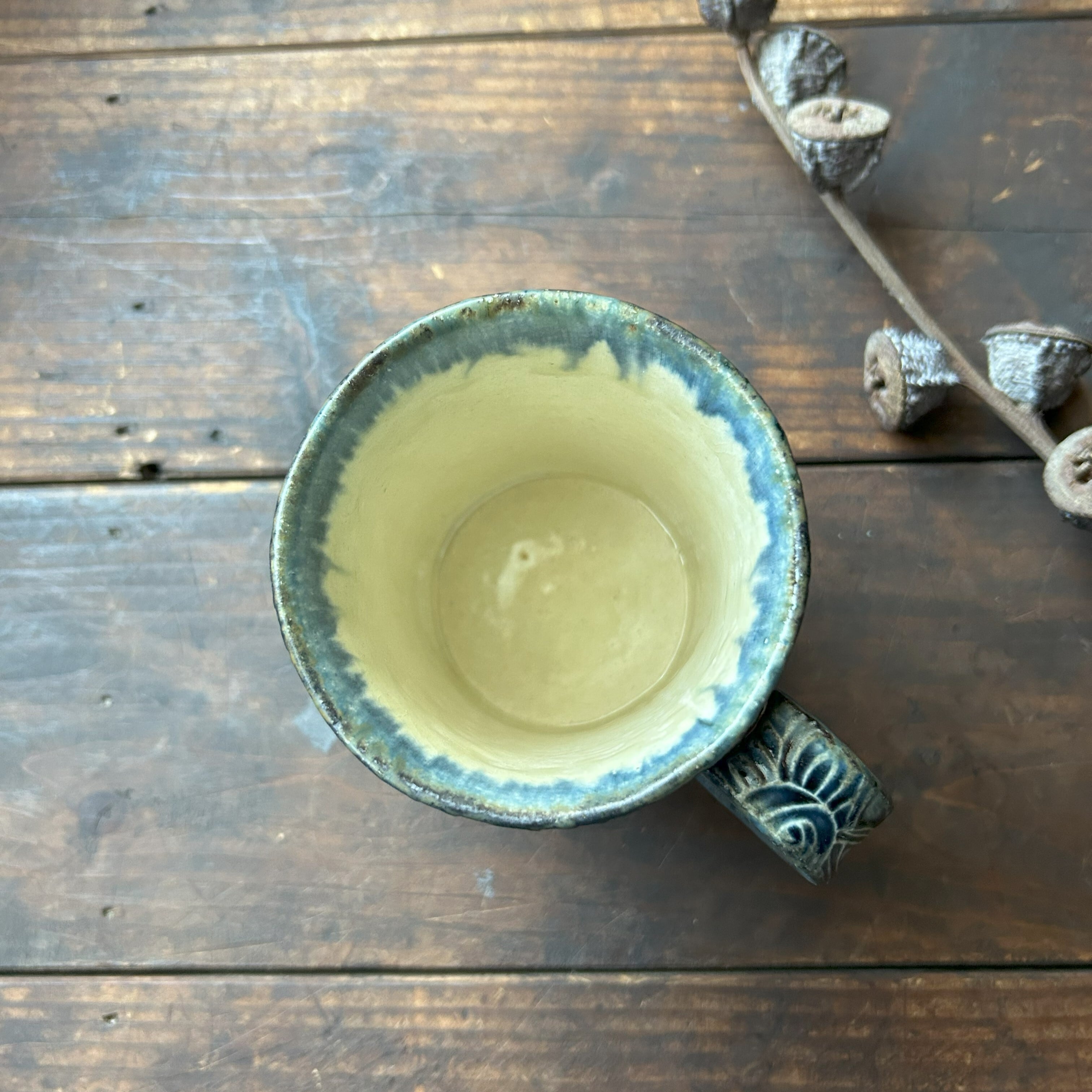 個性的な草の刻文が素敵な藍色釉のマグカップです。光沢感があります。