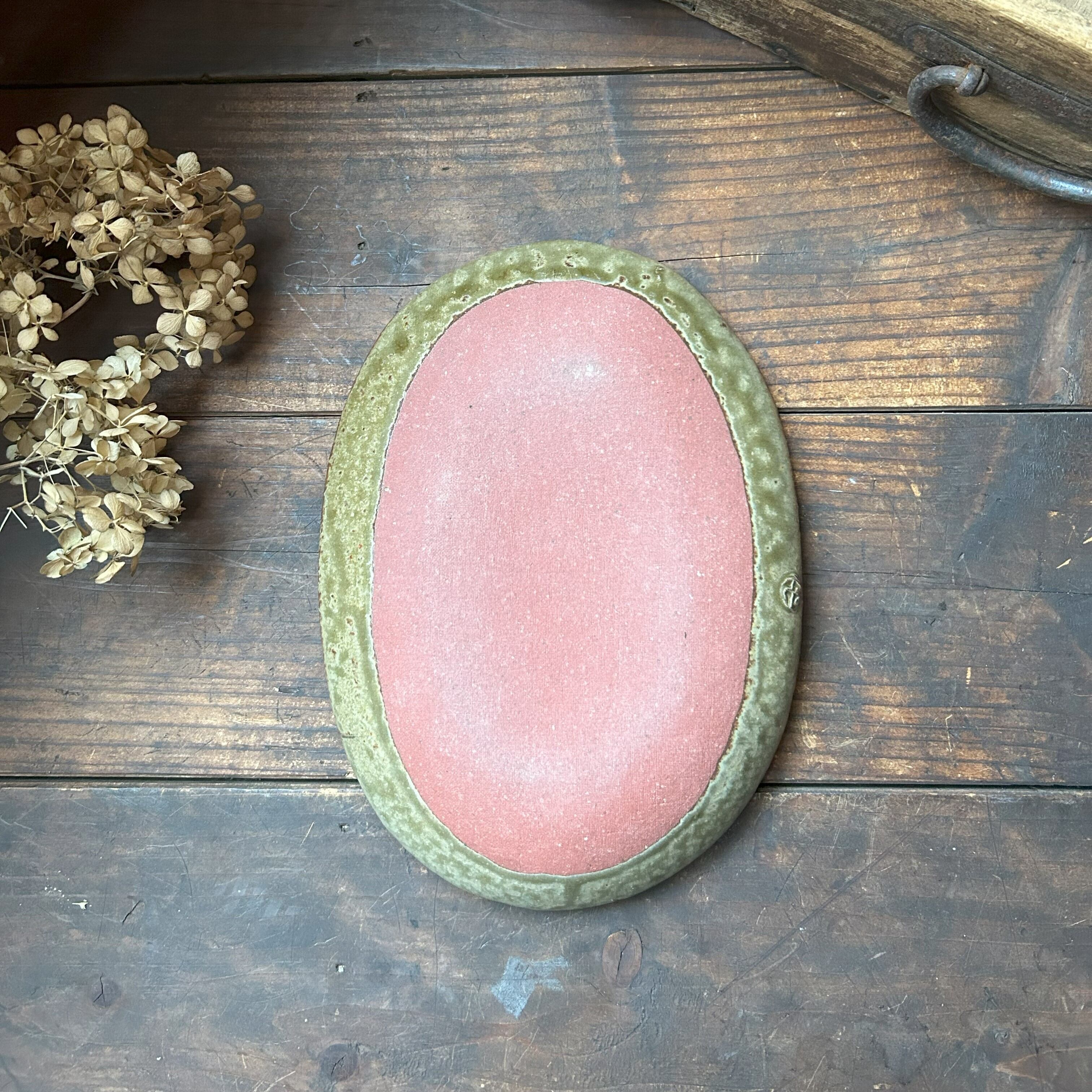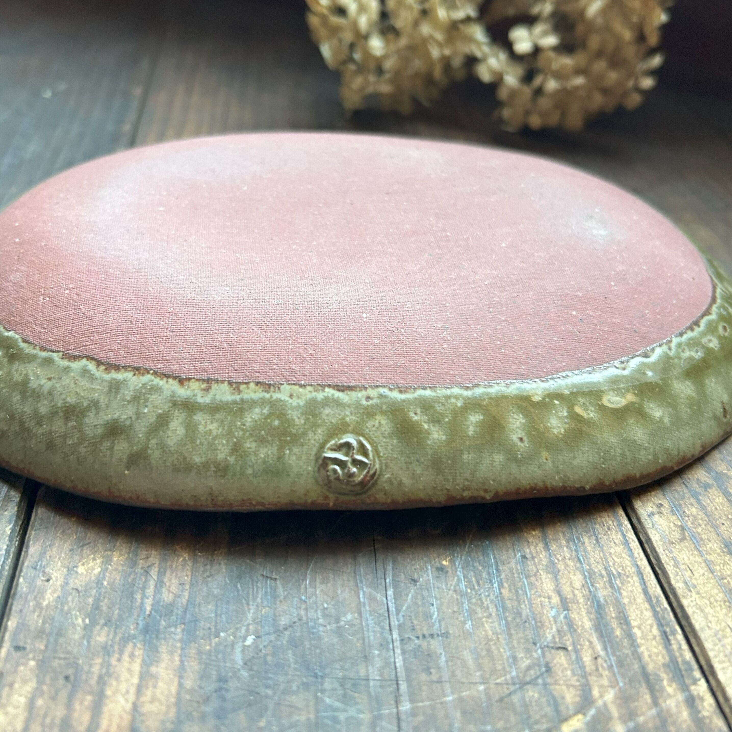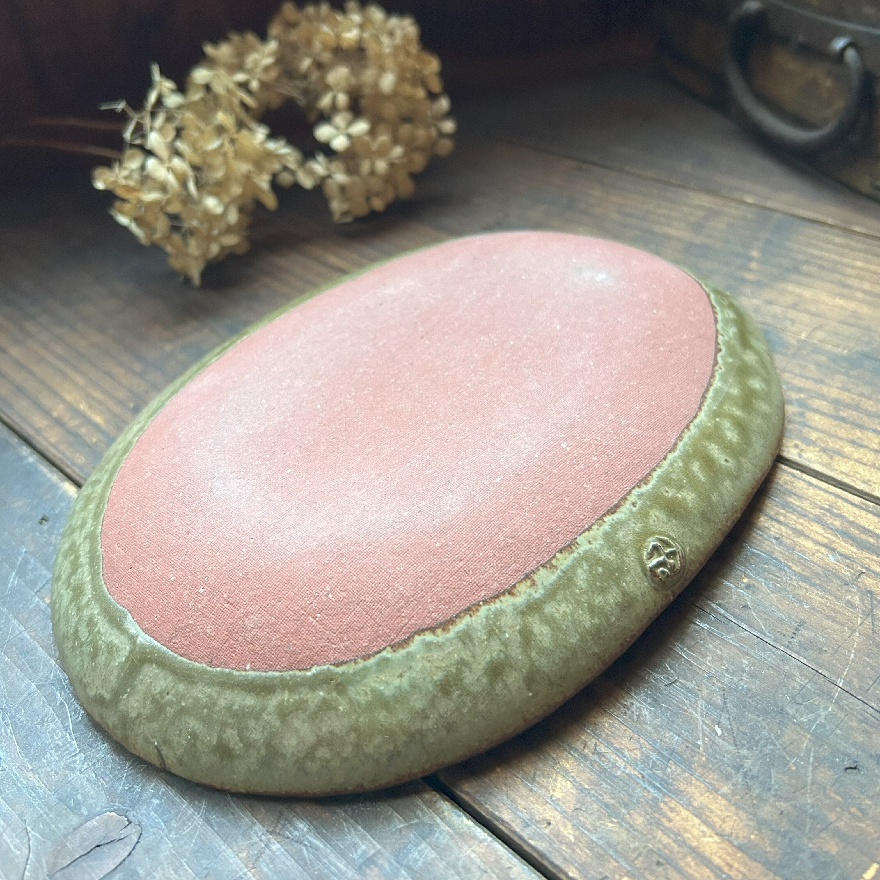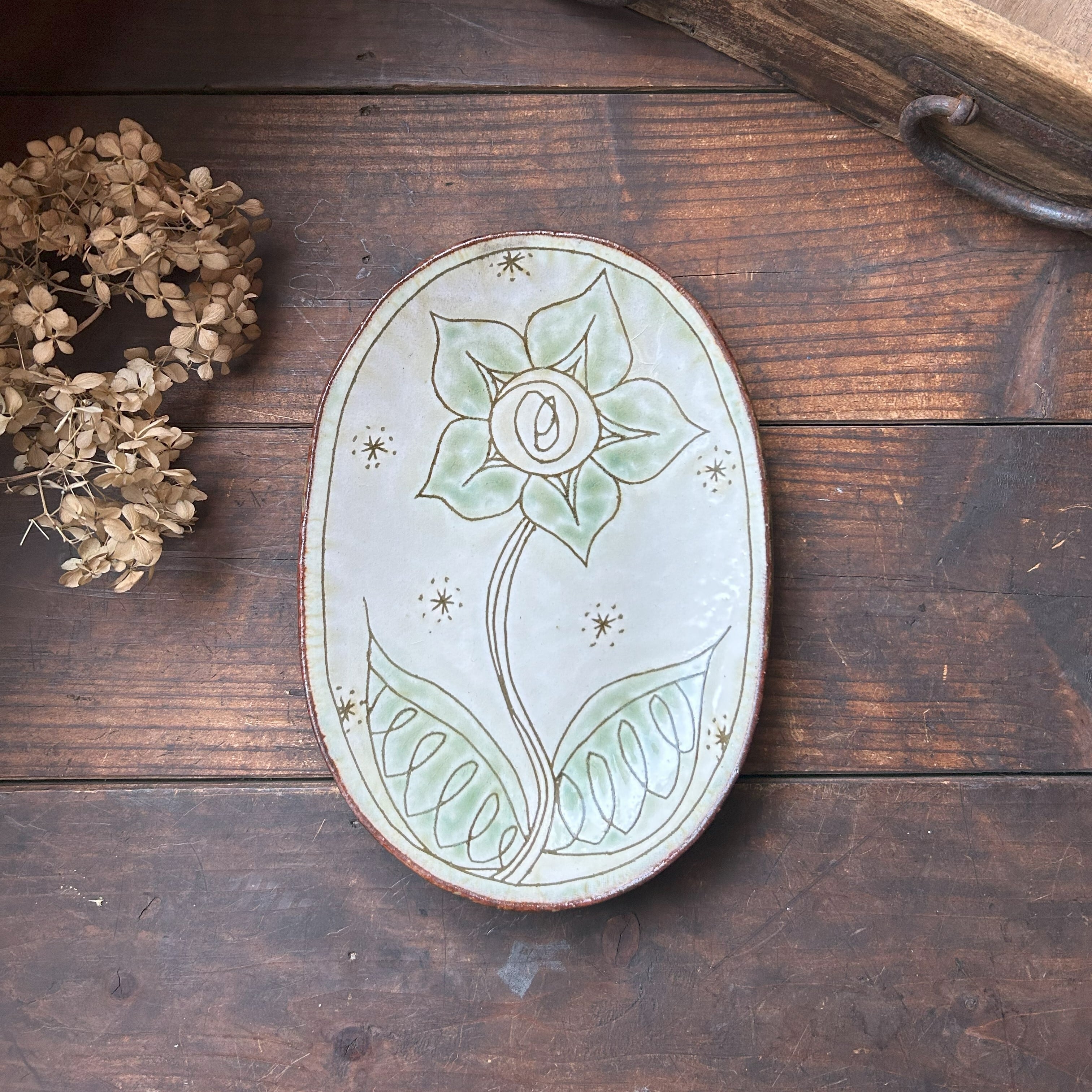 こちらは、掻き落としという伝統的な技法で作られたお皿です。りぢゅう氏オリジナルの温もりあふれる絵柄がとても個性的です。光沢のあるアイボリー色と淡い緑色が優しい雰囲気を醸し出しています。手作りならではの、色合いと柄が素敵なお皿です。