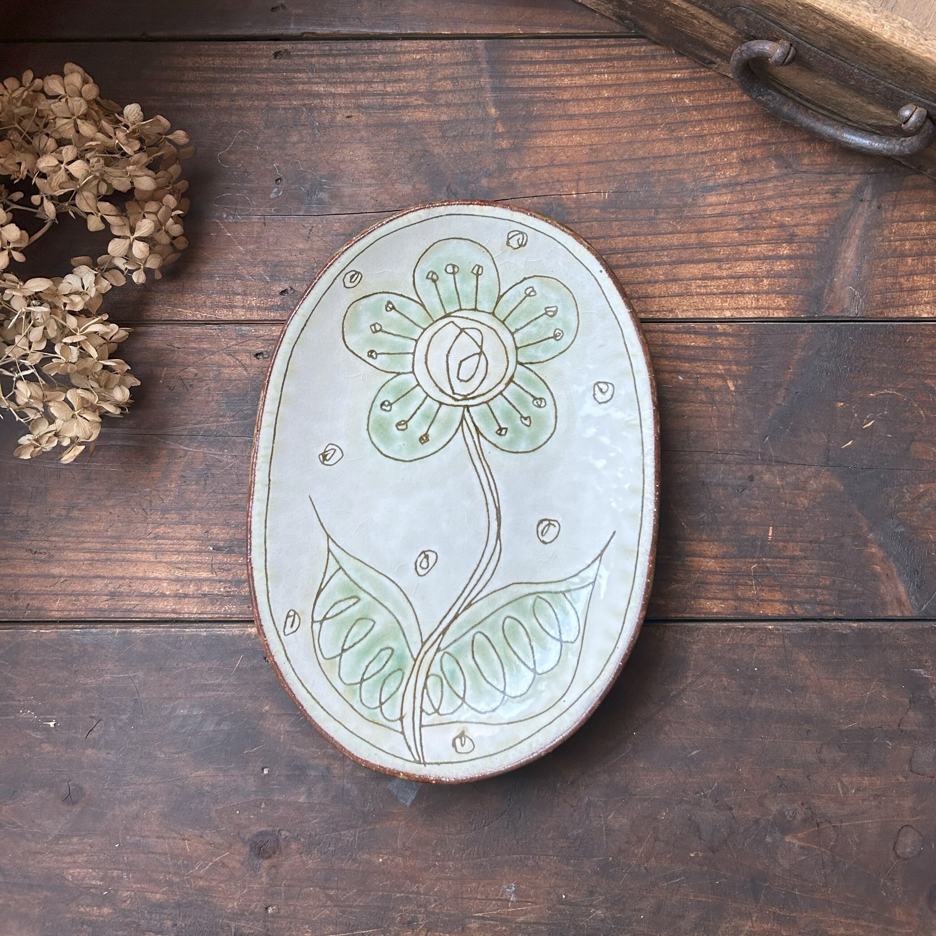 こちらは、掻き落としという伝統的な技法で作られたお皿です。りぢゅう氏オリジナルの温もりあふれる絵柄がとても個性的です。光沢のあるアイボリー色と淡い緑色が優しい雰囲気を醸し出しています。手作りならではの、色合いと柄が素敵なお皿です。