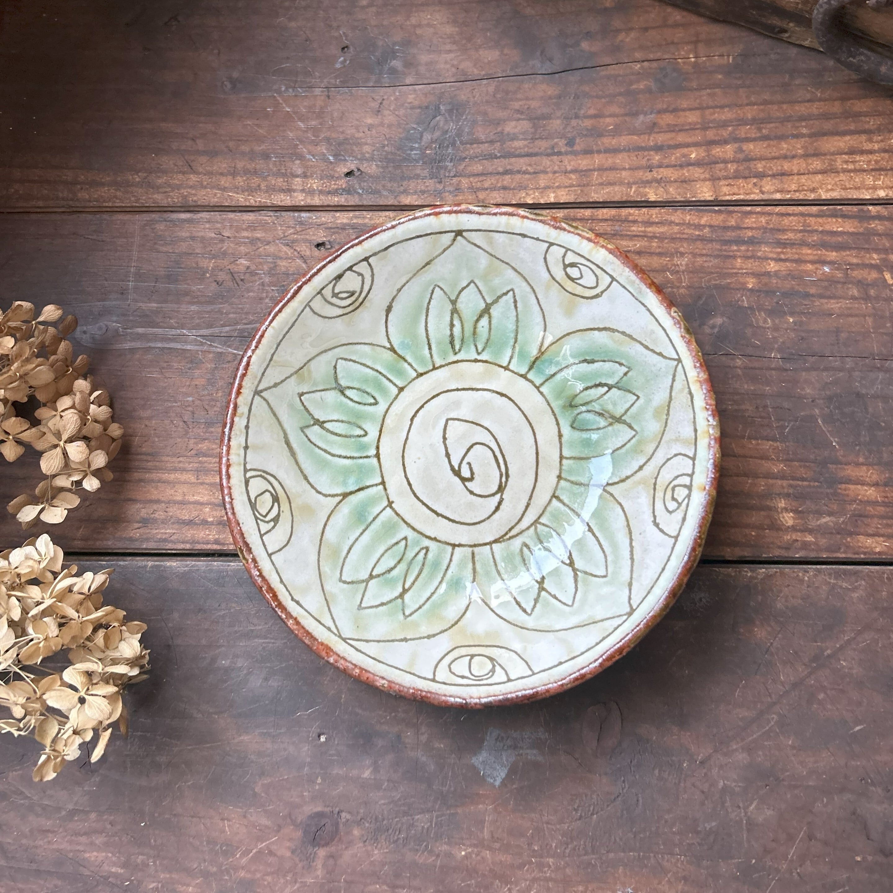掻き落としという伝統的な技法で作られたお皿です。りぢゅう氏オリジナルの温もりあふれる絵柄がとても個性的です。光沢のあるアイボリー色と淡い緑色が優しい雰囲気を醸し出しています。手作りならではの、色合いと柄が素敵なお皿です。