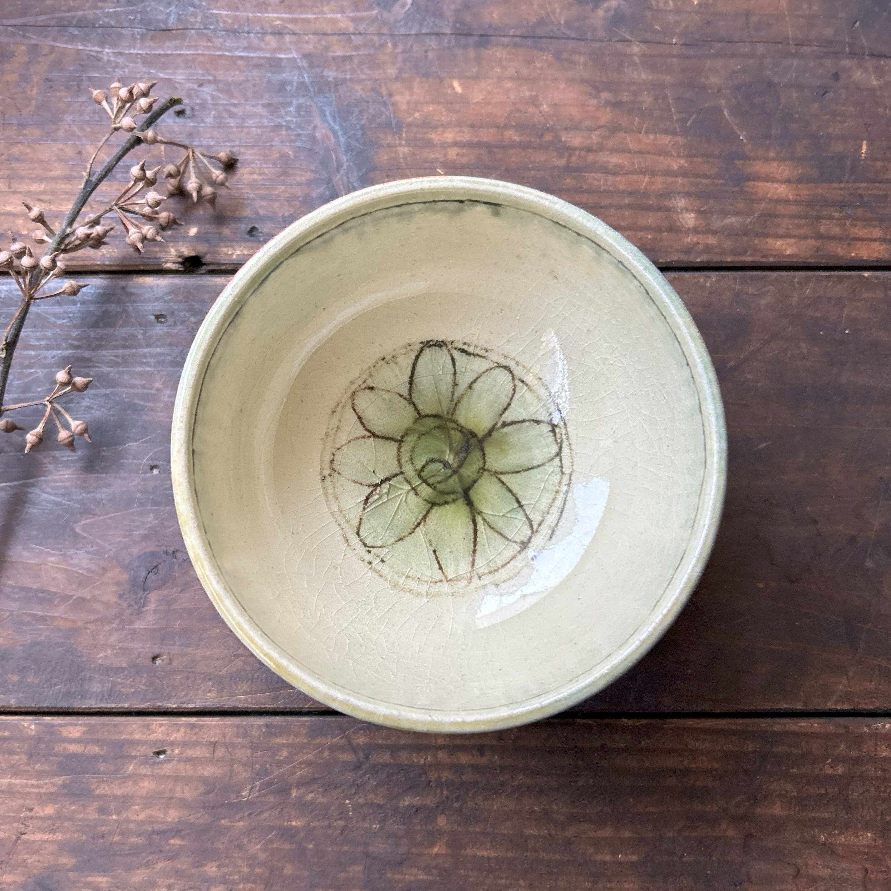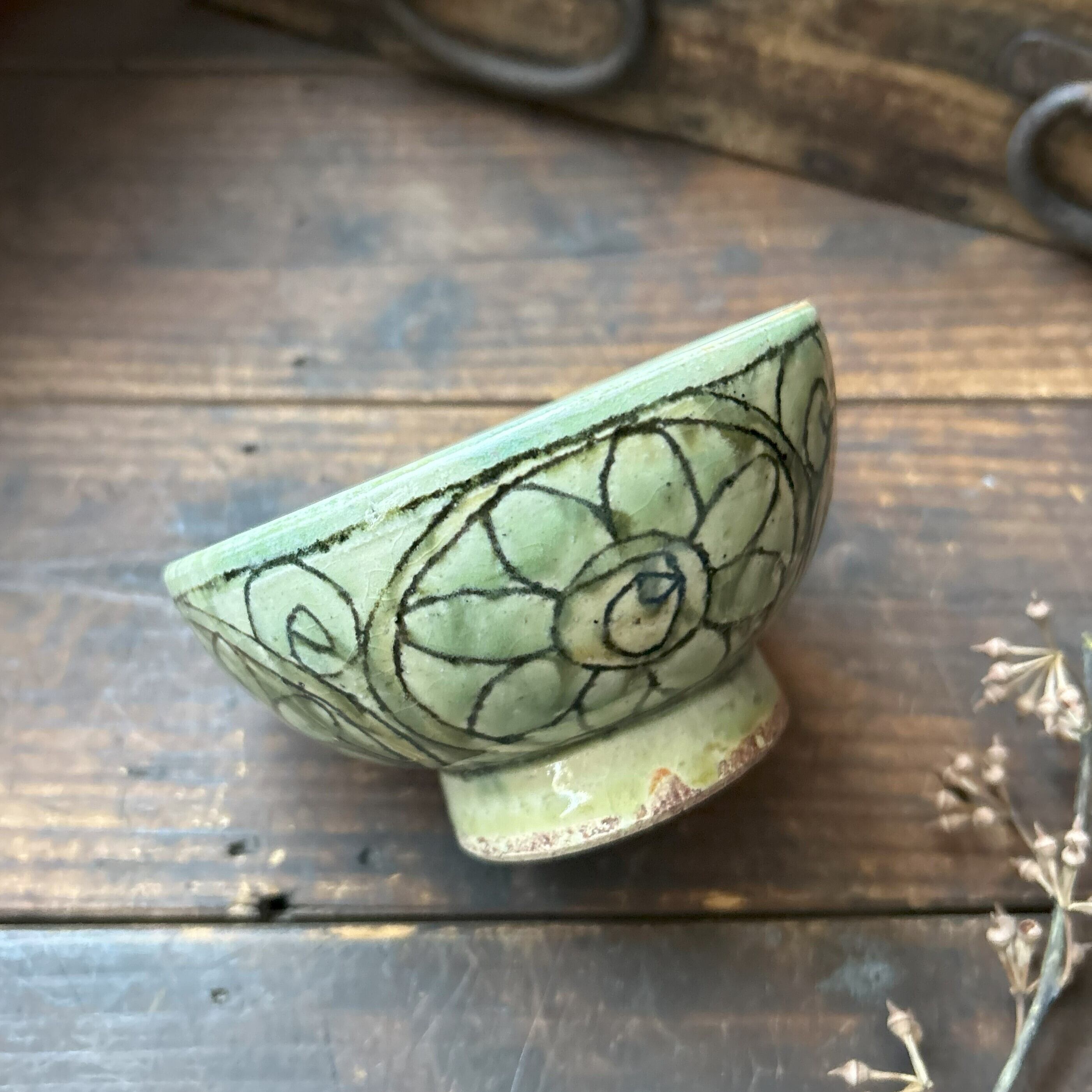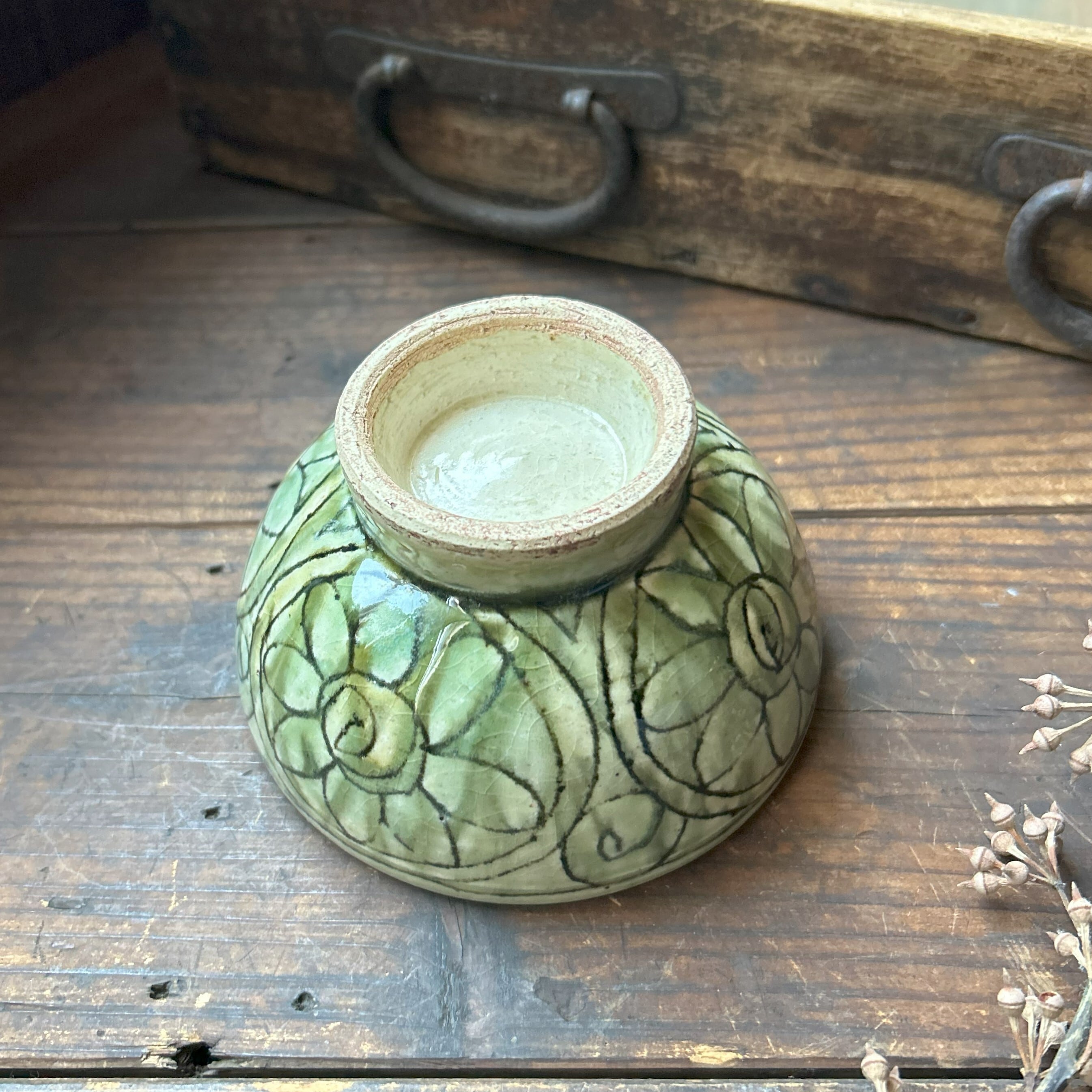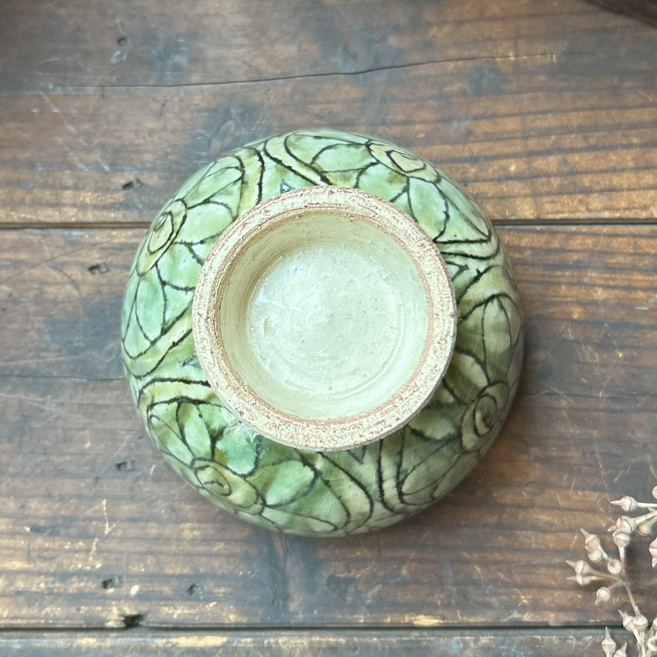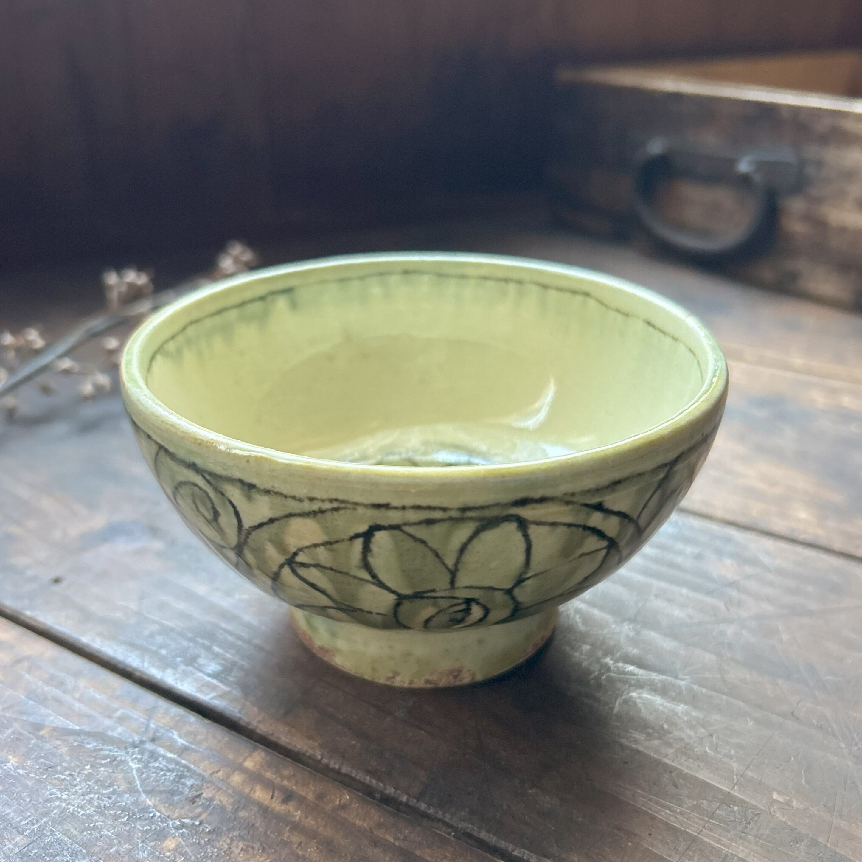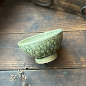 個性豊かな刻文の入った緑灰釉のお茶碗です。毎日のご飯を最後の一粒まで美味しくいただけそうな…そんなお茶碗です。別売のお茶碗(大)と合わせると夫婦茶碗になります。こちらはお茶碗(小)のみの販売になります。